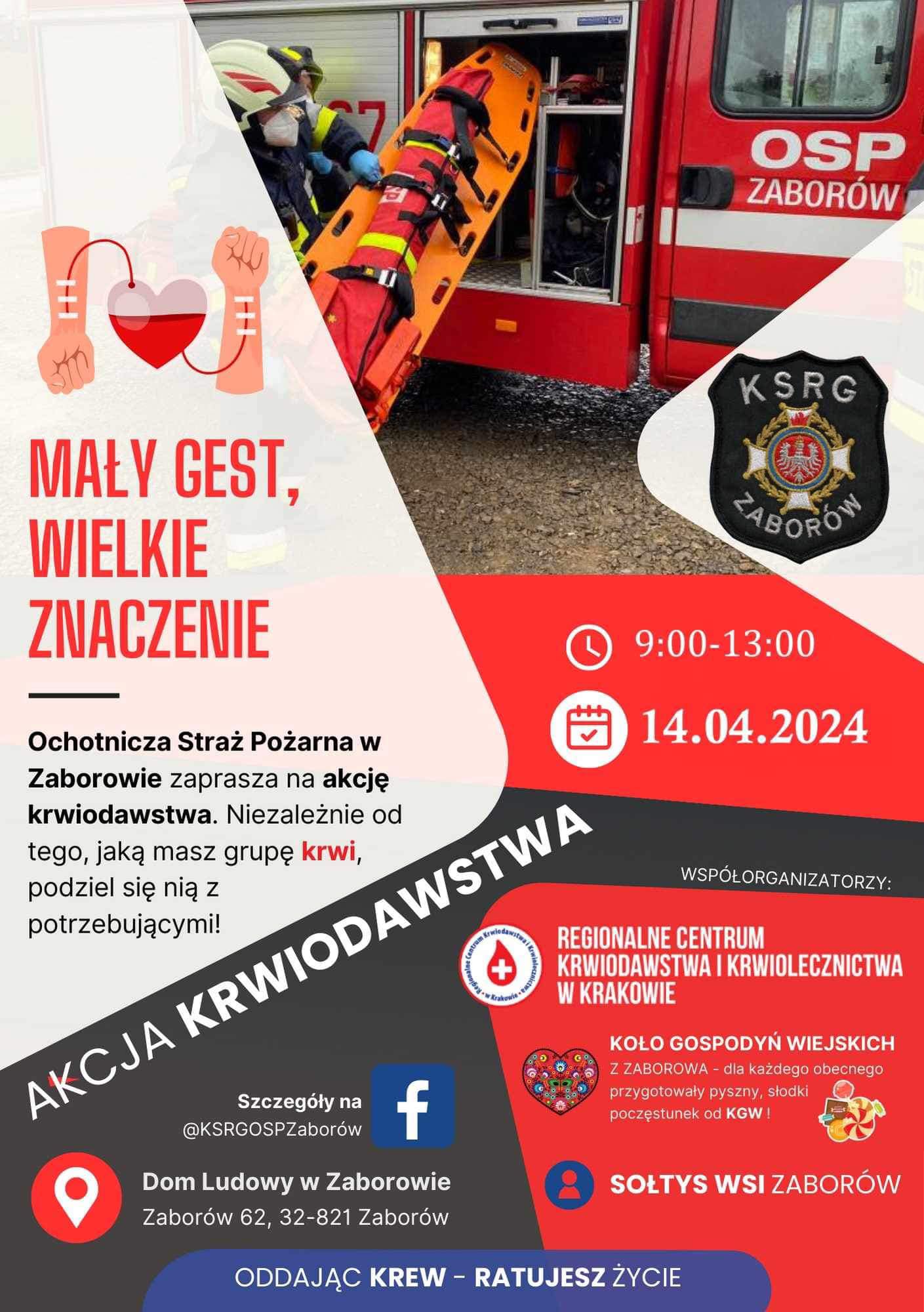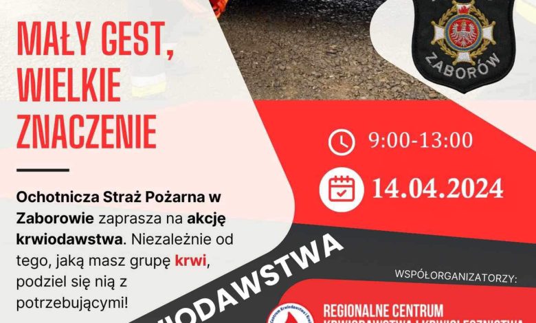Ochotnicza Straż Pożarna w Zaborowie serdecznie zaprasza wszystkich ludzi dobrej woli na akcję krwiodawstwa, która odbędzie się w niedzielę 14 kwietnia 2024 r. od godziny 9:00 do 13:00 w Domu Ludowym w Zaborowie.