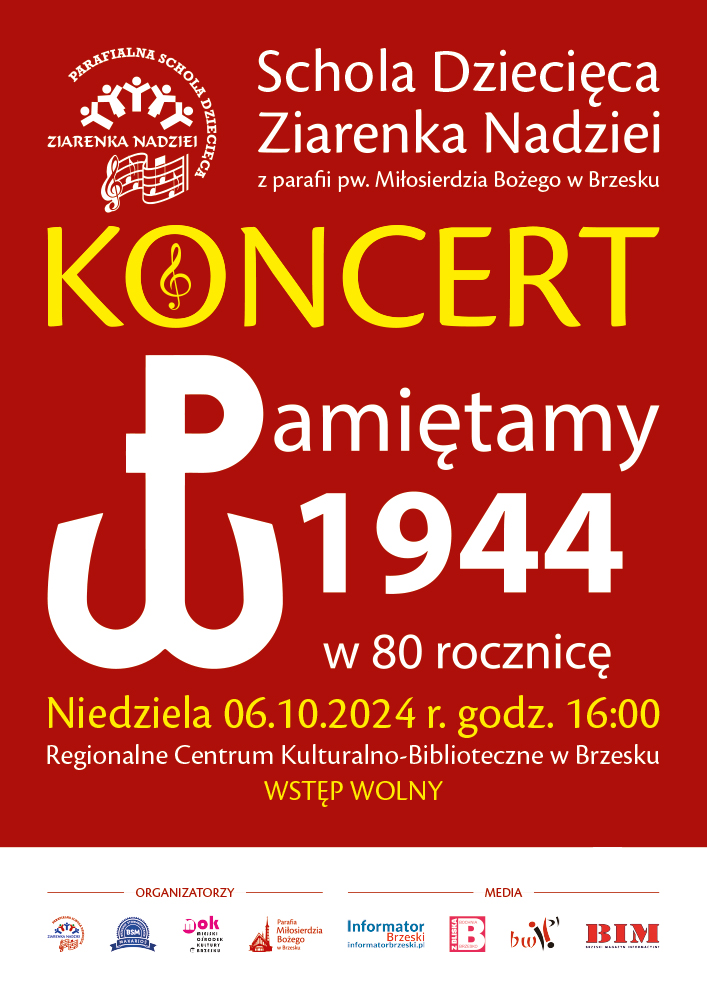 Ziarenka Nadziei, zapraszają w niedzielę, 6 października o godz. 16.00 do Regionalnego Centrum Kulturalno-Bibliotecznego (RCKB) na koncert pt. „1944-Pamiętamy”, upamiętniający 80. rocznicę wybuchu Powstania Warszawskiego.