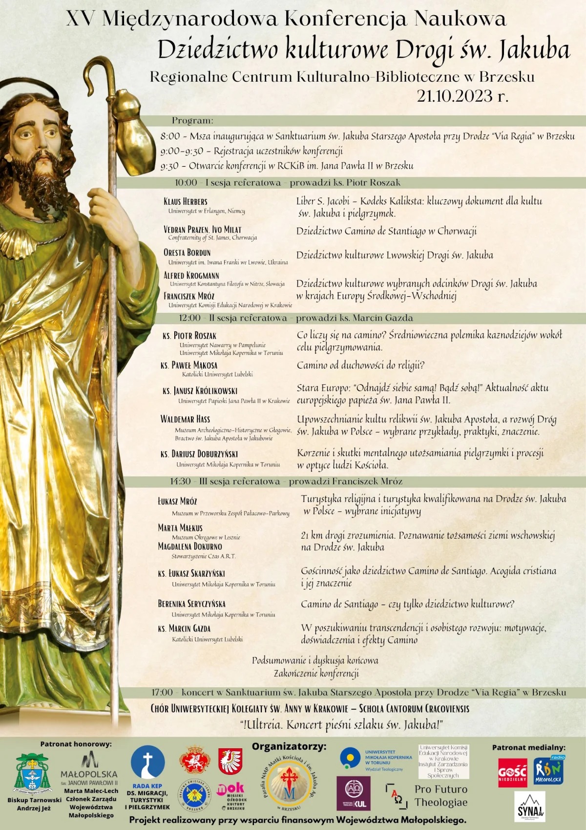 Parafia Św. Jakuba w Brzesku zaprasza w sobotę 21 października 2023 r. do Regionalnego Centrum Kulturalno-Bibliotecznego w Brzesku, gdzie odbędzie się XV Międzynarodowa Konferencja Naukowa – Dziedzictwo kulturowe Drogi św. Jakuba. Wstęp wolny!