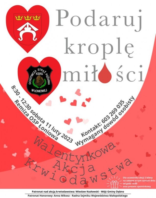 Ochotnicza Straż Pożarna w Łoniowej oraz Wójt Gminy Dębno Wiesław Kozłowski serdecznie zapraszają wszystkich ludzi dobrej woli na kolejną Walentynkową akcję krwiodawstwa „Podaruj Kroplę Miłości”, która odbędzie się w sobotę 11 lutego od godziny 8:30 do 12:30 w Remizie OSP Łoniowa.