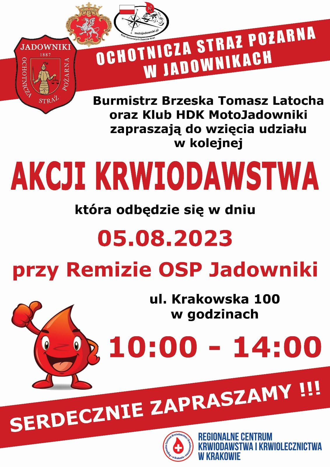 Ochotnicza Straż Pożarna w Jadownikach serdecznie zaprasza wszystkich ludzi dobrej woli na akcję krwiodawstwa, która odbędzie się w sobotę 5 sierpnia 2023 r. od godziny 10:00 do 14:00 w krwiobusie przed remizą OSP Jadowniki.