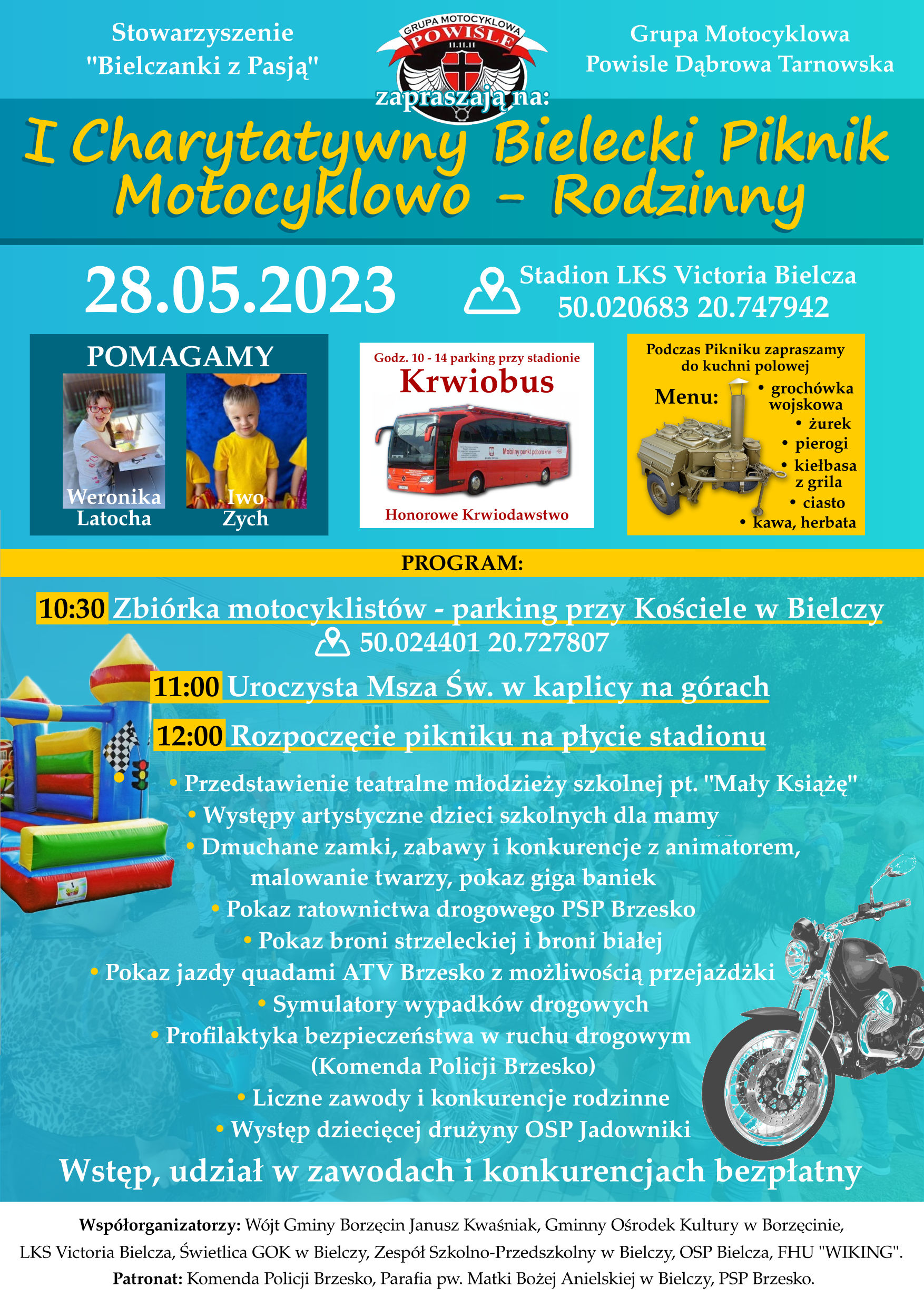 O godzinie 10.30 na stadionie LKS Viktoria Bielcza rozpoczął się I Charytatywny Bielecki Piknik Motocyklowo-Rodzinny. Na wydarzenie zapraszają Stowarzyszenie „Bielczanki z Pasją” oraz Grupa Motocyklowa Powiśle Dąbrowa Tarnowska. Organizatorzy przygotowali szereg ciekawych atrakcji dla całych rodzin.