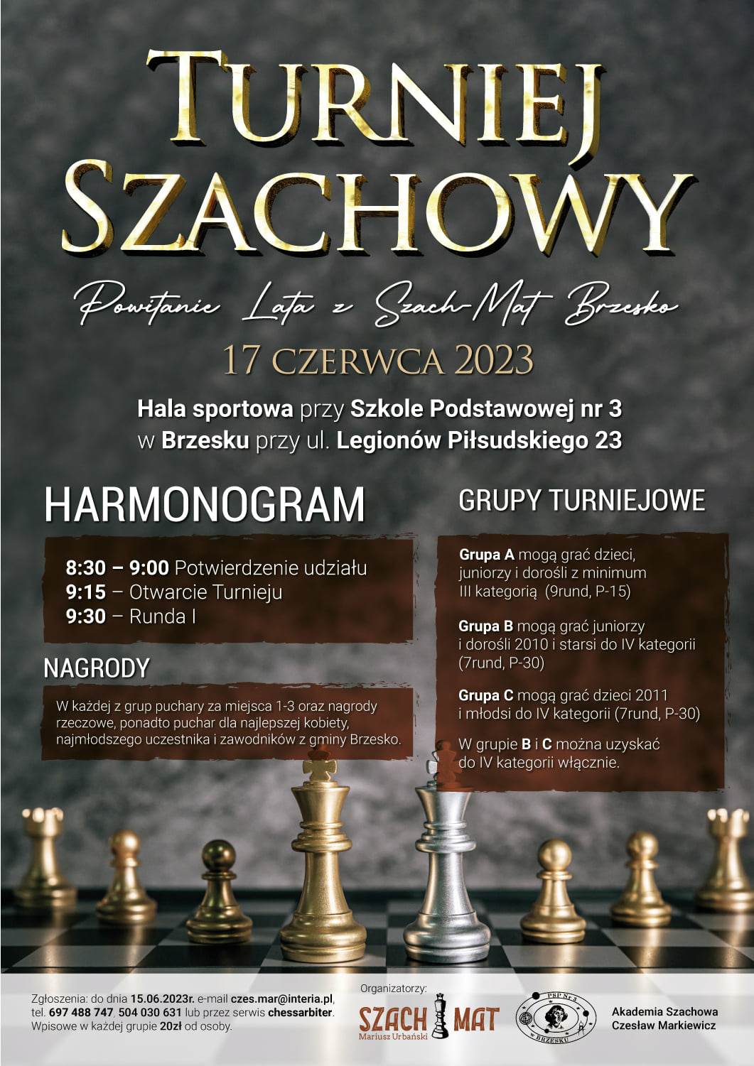 W sobotę 17 czerwca 2023 r. w hali sportowej przy Szkole Podstawowej nr 3 w Brzesku przy ul. Legionów Piłsudskiego 23 odbędzie się turniej szachowy „Powitanie lata w Szach mat Brzesko”. Swój udział zadeklarowało ponad 150 zawodników z Województwa Małopolskiego i Podkarpackiego.