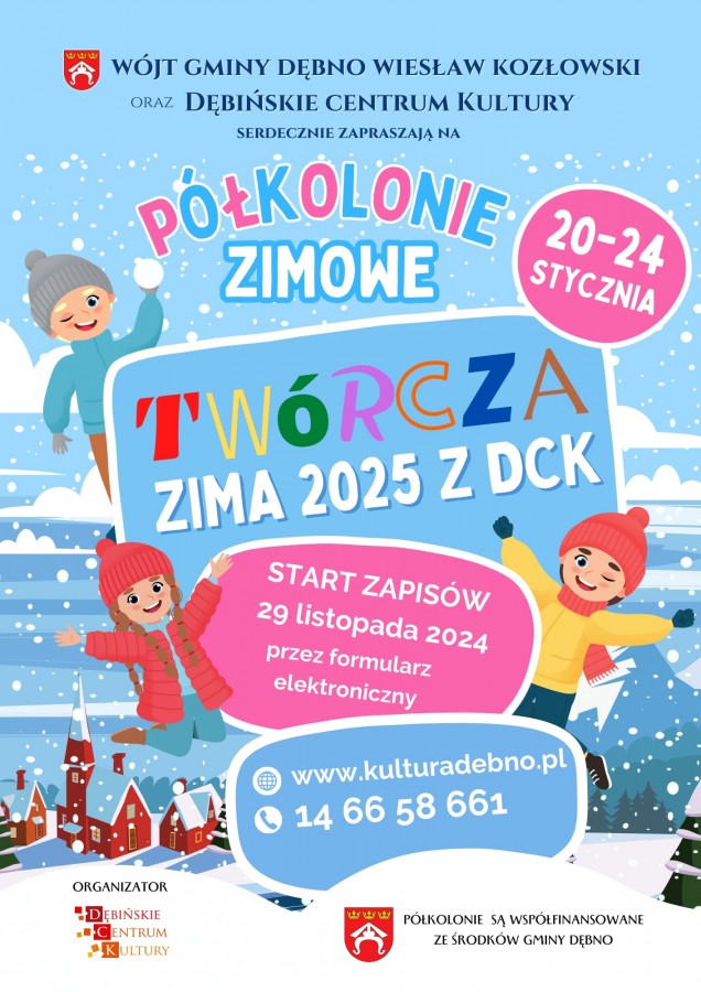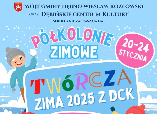 Wójt Gminy Dębno Wiesław Kozłowski wraz z Dębińskim Centrum Kultury serdecznie zapraszają dzieci z terenu naszej gminy do udziału w półkoloniach feryjnych, które pod nazwą „Twórcza zima 2025 z DCK”, będą organizowane w Dębińskim Centrum Kultury w Jastwi.