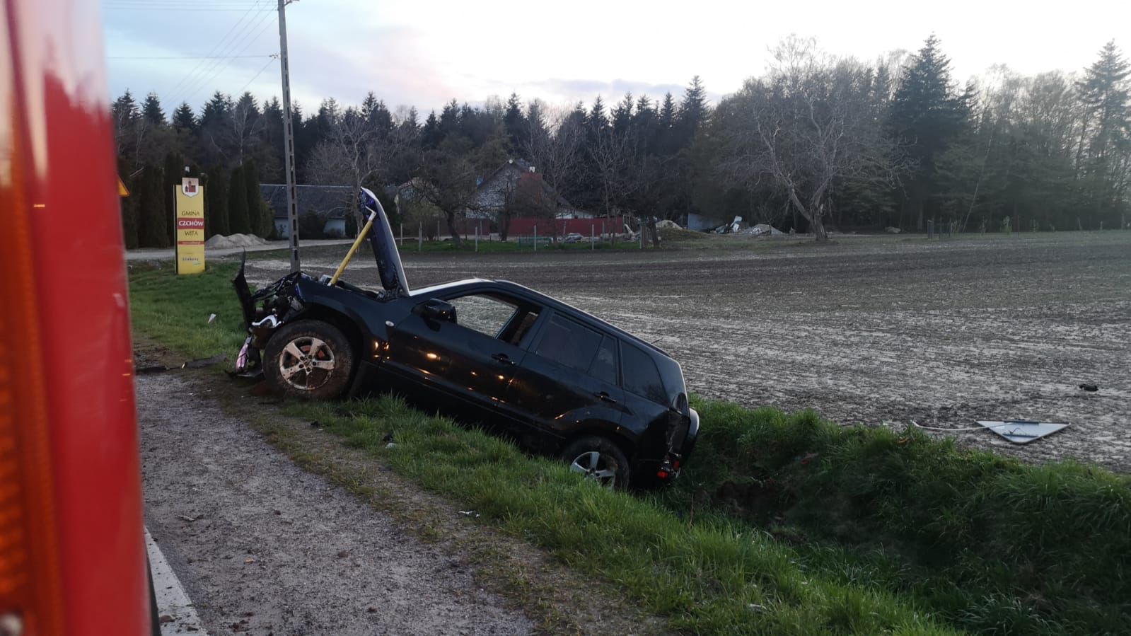 Z nieustalonych jeszcze przyczyny kierujący samochodem osobowym zjechał z drogi i uderzył w znak (ograniczenia prędkości do 70 km/h oraz znak ostrzegawczy niebezpieczny zakręt w lewo). Kierujący pojazdem następnie oddalił się z miejsca zdarzenia.