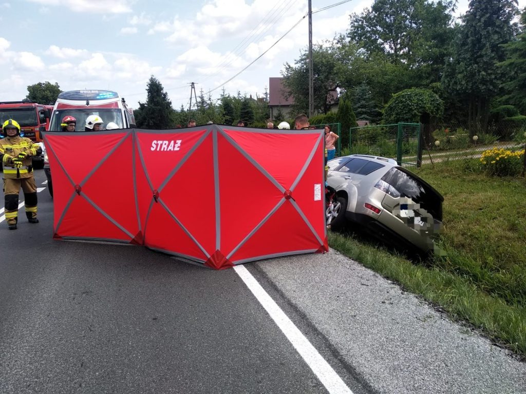 Kierujący SUV-em stracił panowanie nad pojazdem i uderzył w przydrożny przepisy drogowy w następstwie zdarzenia poszkodowane zostały 2 osoby.