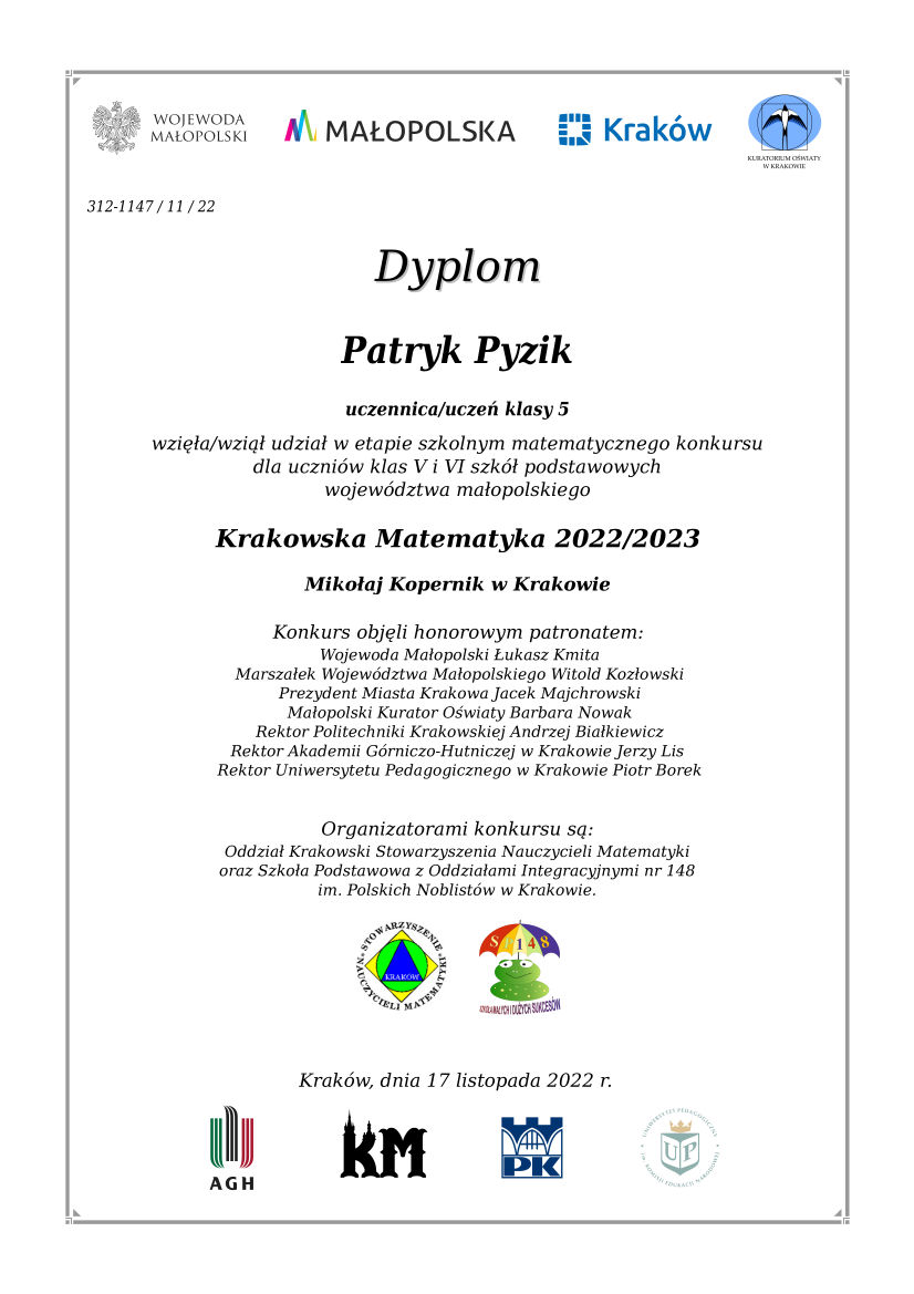 17 listopada 2022 r. w Zespole Szkolno – Przedszkolnym w Borzęcinie Dolnym odbył się etap szkolny małopolskiego konkursu pt.” Krakowska matematyka”.