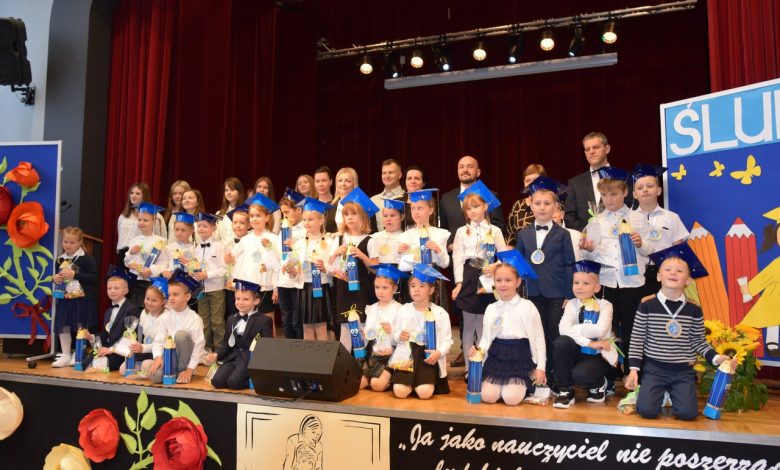 Wszystkich obecnych powitała wychowawczyni klasy, Halina Pudełko. Część artystyczna, a w niej pięknie recytowane przez siedmiolatków wiersze, melodyczne piosenki oraz taniec – „Swing w uliczce…”, były kolejnym punktem programu. Po nim nastąpiła główna część uroczystości, a więc ślubowanie oraz pasowanie na uczniów, którego dokonała Dyrektor Elżbieta Chochlińska. Tym samym 26 dzieci z klasy Ia stało się pełnoprawnymi uczniami i zostali przyjęci do grona uczniów miejscowej szkoły podstawowej.