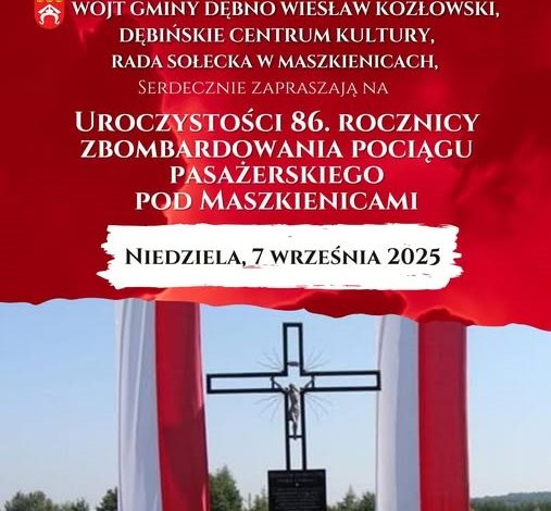 Wójt Gminy Dębno Wiesław Kozłowski, Dębińskie Centrum Kultury oraz Rada Sołecka w Maszkienicach zapraszają do udziału w uroczystościach 86. rocznicy zbombardowania pociągu pasażerskiego pod Maszkienicami, które odbędą się w niedzielę, 7 września 2025 roku.