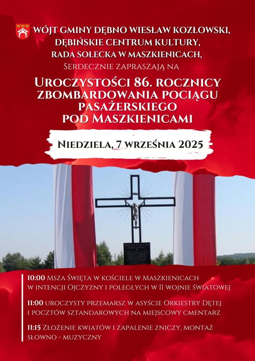 Wójt Gminy Dębno Wiesław Kozłowski, Dębińskie Centrum Kultury oraz Rada Sołecka w Maszkienicach zapraszają do udziału w uroczystościach 86. rocznicy zbombardowania pociągu pasażerskiego pod Maszkienicami, które odbędą się w niedzielę, 7 września 2025 roku.