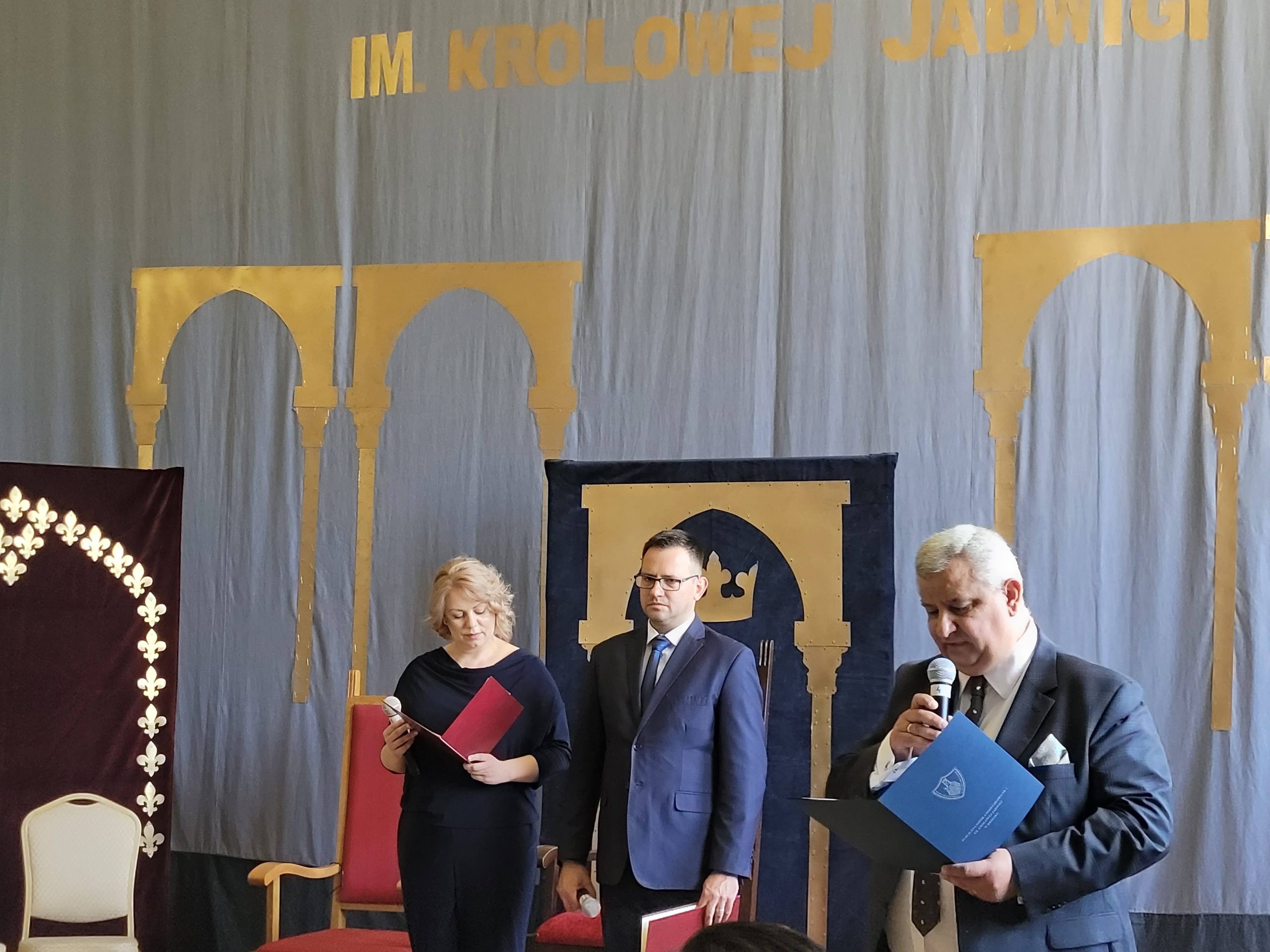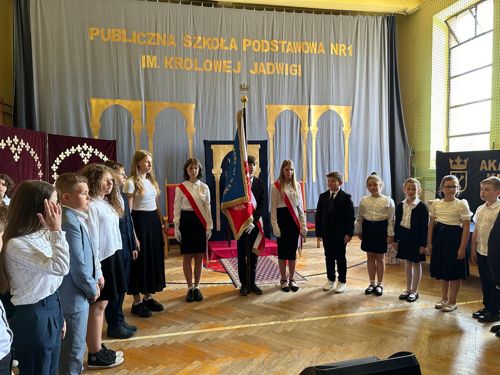 Podniosłym i wzruszającym momentem było przekazanie sztandaru przez przedstawicieli Rady Rodziców oraz ślubowanie uczniów. Całą uroczystość uświetniła część artystyczna, ukazująca życie św. Królowej Jadwigi, dostojnie zaprezentowana przez młodych aktorów.