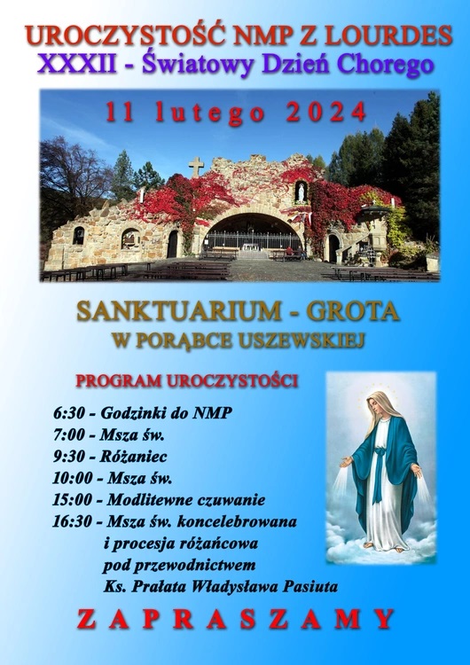 To właśnie 11 lutego w Światowym Dniu Chorego w Porąbce Uszewskiej odbędzie się doroczna modlitwa w intencji chorych. Rozpocznie się czuwaniem w kościele od godz. 15, a następnie Eucharystią o 16.30. Zakończy się błogosławieństwem lurdzkim, procesją z lampionami do groty i nabożeństwem do Matki Bożej.