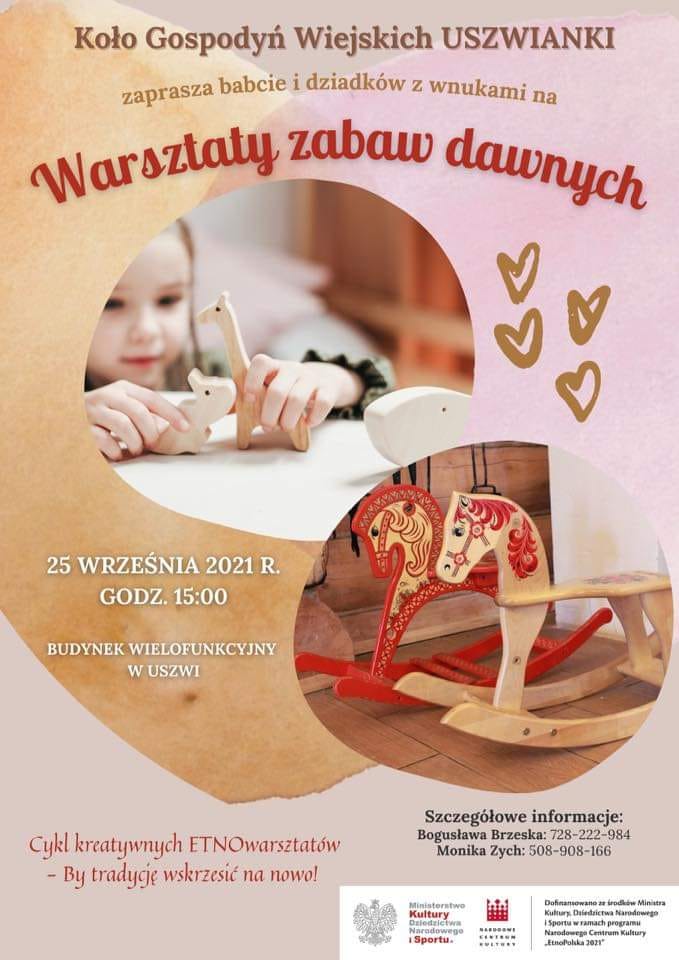 W sobotę 25 września 2021 r. Koło Gospodyń Wiejskich z Uszwi zaprasza na warsztaty zabaw dawnych. Jak podkreślają organizatorki – to powrót na chwilę do czasów, kiedy do dobrej zabawy wystarczyły dzieciom: patyk, liść, woda, kreda… Warsztaty odbędą się w ramach projektu „By tradycję wskrzesić na nowo”.