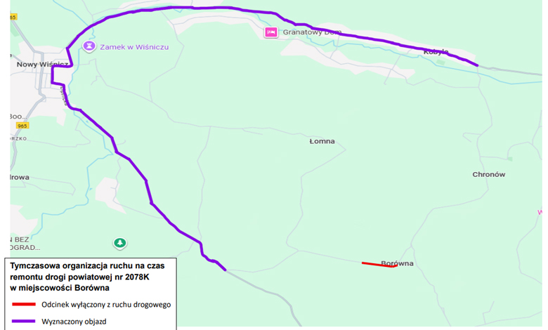 Objazd zamkniętego odcinka został wyznaczony drogami powiatowymi i oznaczony kolorem fioletowym na załączonej mapie.