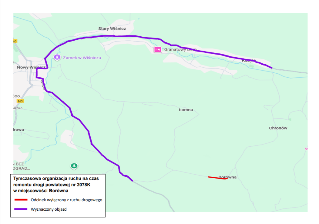 Objazd zamkniętego odcinka został wyznaczony drogami powiatowymi i oznaczony kolorem fioletowym na załączonej mapie.