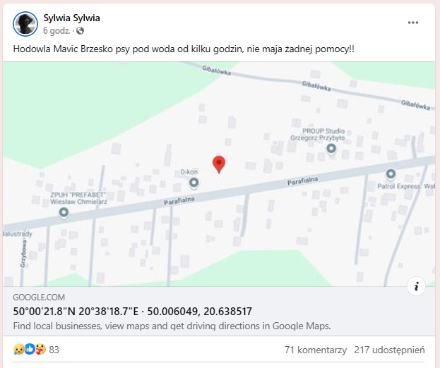 W grupie NIE!!!DLA BANDYTÓW MALTRETUJĄCYCH ZWIERZĘTA! © pojawił się wpis sugerujący, że jedna z hodowli psów ma się znajdować pod wodą. Mapa wskazuje na Szczepanów oraz ulicę Parafialną w Mokrzyskach. Wpis zyskał ponad 200 udostepnień! Z kolei inna wiadomość jaka pojawiła się w sieci, sugerowała, że na ul. Ogrodowej znajdują się psy wymagające pomocy.