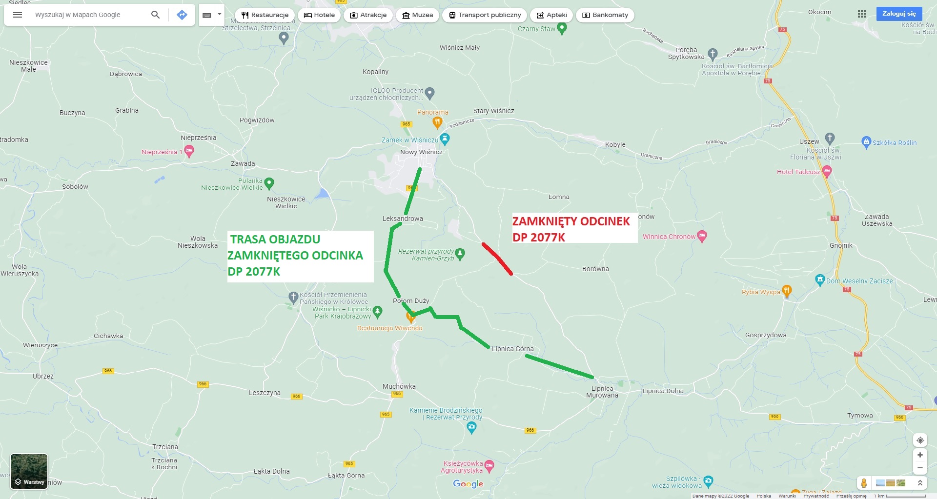W związku z prowadzeniem robót drogowych na części drogi powiatowej nr 2077K pomiędzy Nowym Wiśniczem a Lipnicą Murowaną w miejscowościach Łomna i Leksandrowa droga będzie zamknięta dla ruchu drogowego w dniach 7 do 30 grudnia 2022 r.