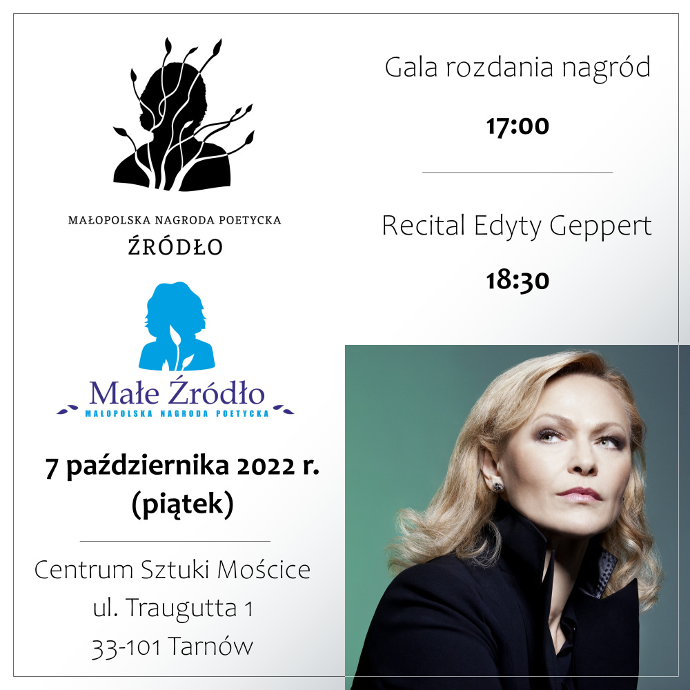 W piątek, 7 października 2022 r. o godz. 17:00 w Centrum Sztuki Mościce w Tarnowie odbędzie się Gala wręczenia nagród w ramach VI edycji Małopolskiej Nagrody Poetyckiej „Źródło” i drugiej edycji „Małego Źródła”. W trakcie uroczystości nagrodzone utwory zaprezentują sami laureaci Konkursu, a wszyscy obecni będą mogli odebrać pokonkursową publikację zawierającą nagrodzone i wyróżnione wiersze.
