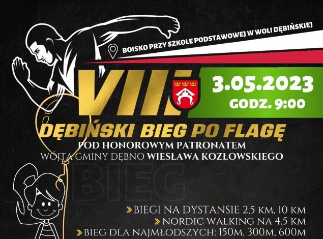 Wójt Gminy Dębno Wiesław Kozłowski serdecznie zaprasza do wzięcia udziału w VIII edycji Dębińskiego Biegu po Flagę! Bieg odbędzie się 3 maja 2023 r.