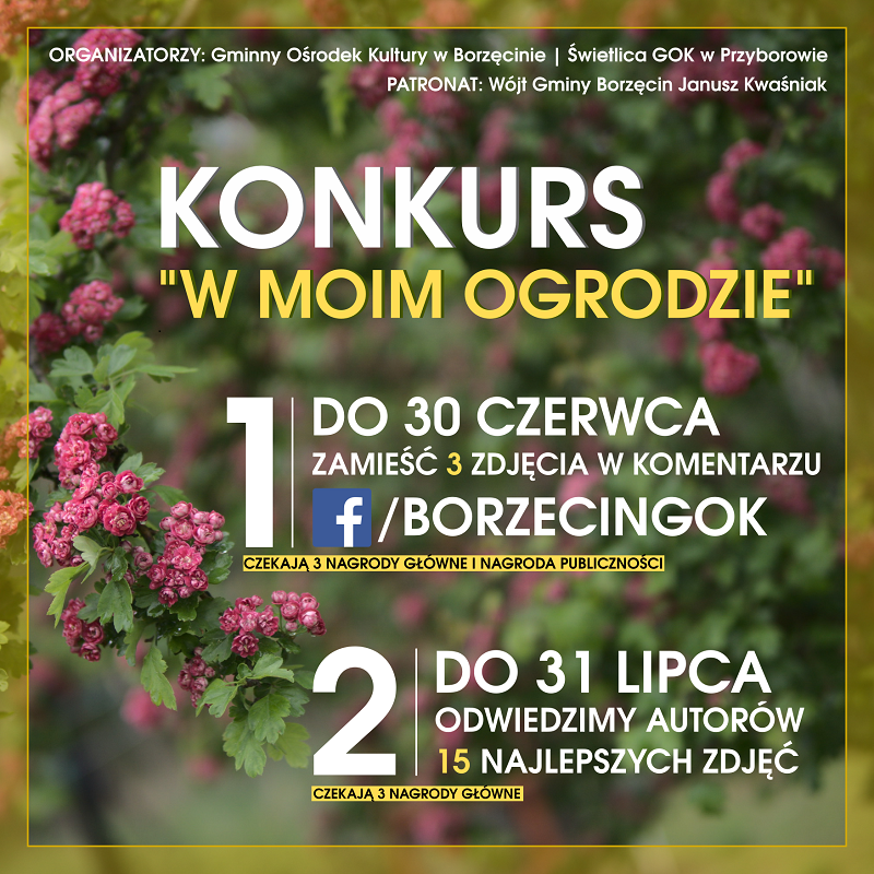 Co ważne, zgłoszenie do obu części Konkursu następuje poprzez zamieszczenie w formie komentarza fotografii ogrodu pod postem konkursowym pt. „W moim ogrodzie” na profilu Gminnego Ośrodka Kultury pod adresem: facebook.com/borzecingok