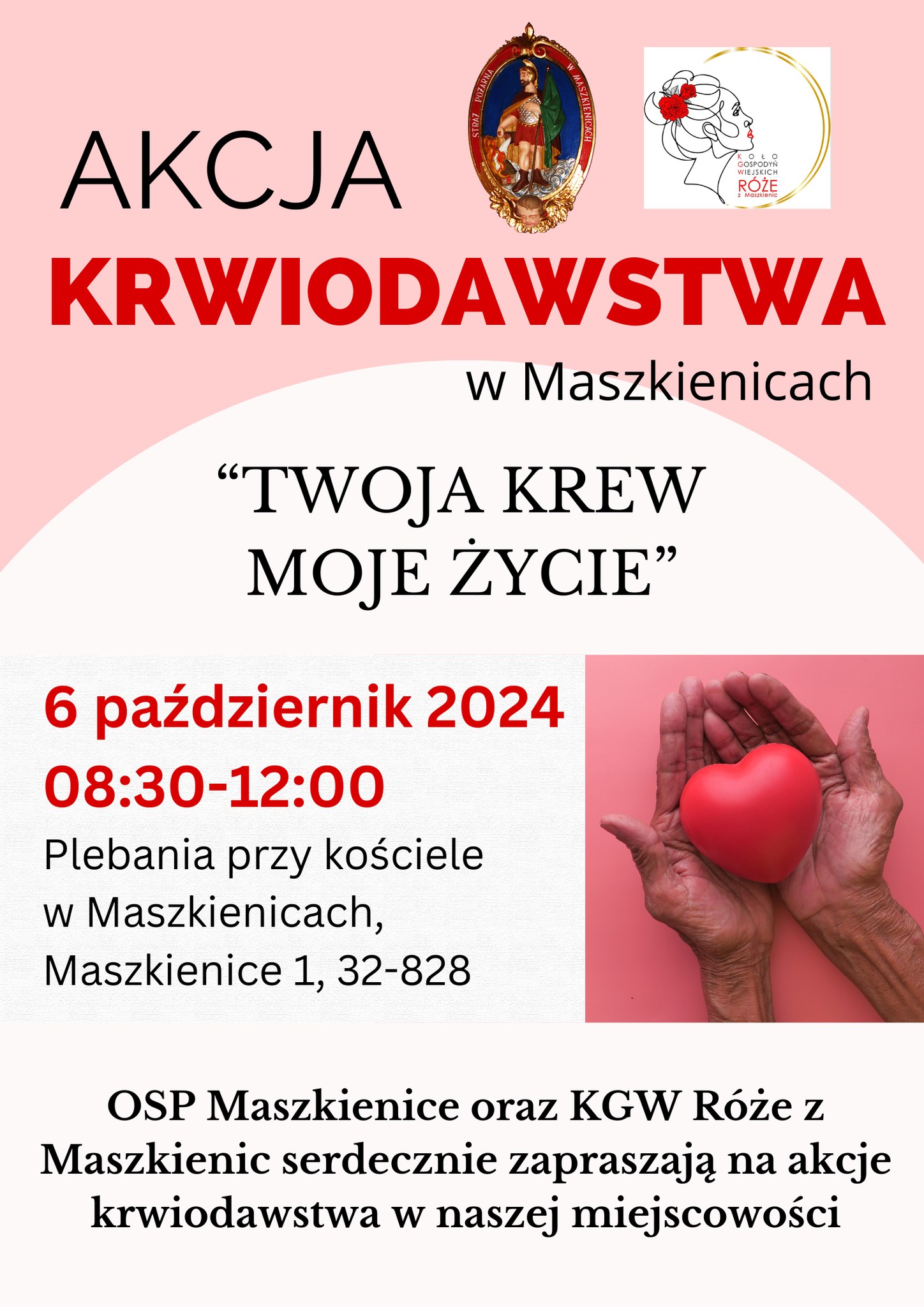 Serdecznie zapraszamy wszystkich chętnych na Akcję Honorowego Oddawania Krwi organizowaną przez OSP Maszkienice oraz Koło Gospodyń Wiejskich Róże z Maszkienic.