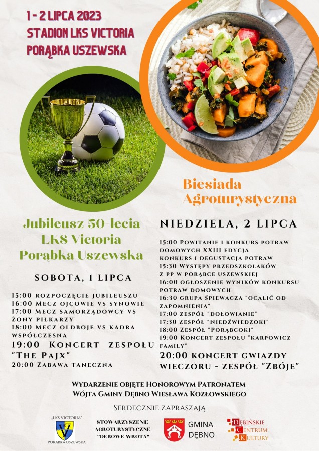 W niedzielę 2 lipca 2023 r. odbędzie się kolejna już edycja Biesiady Agroturystycznej, która rozpocznie się o godzinie 15.00 na stadionie LKS Victoria Porąbka Uszewska XXIII edycją konkursu potraw domowych.