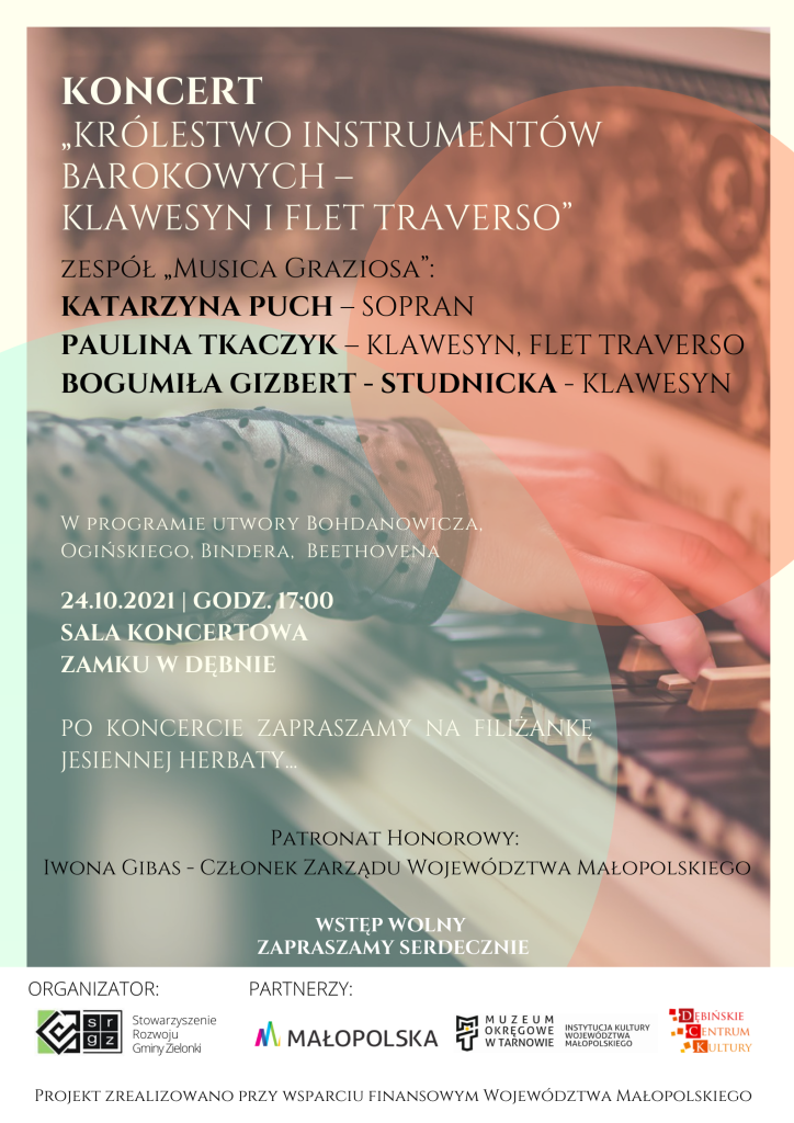 W najbliższą niedzielę 24 października 2021 r. o godz. 17:00 w sali koncertowej dębińskiego zamku odbędzie się koncert muzyki barokowej. Przed publicznością wystąpią: Katarzyna Puch – sopran, Paulina Tkaczyk – klawesyn i flet traverso, Bogumiła Gizbert – Studnicka – klawesyn, dyrektor artystyczny cyklu.