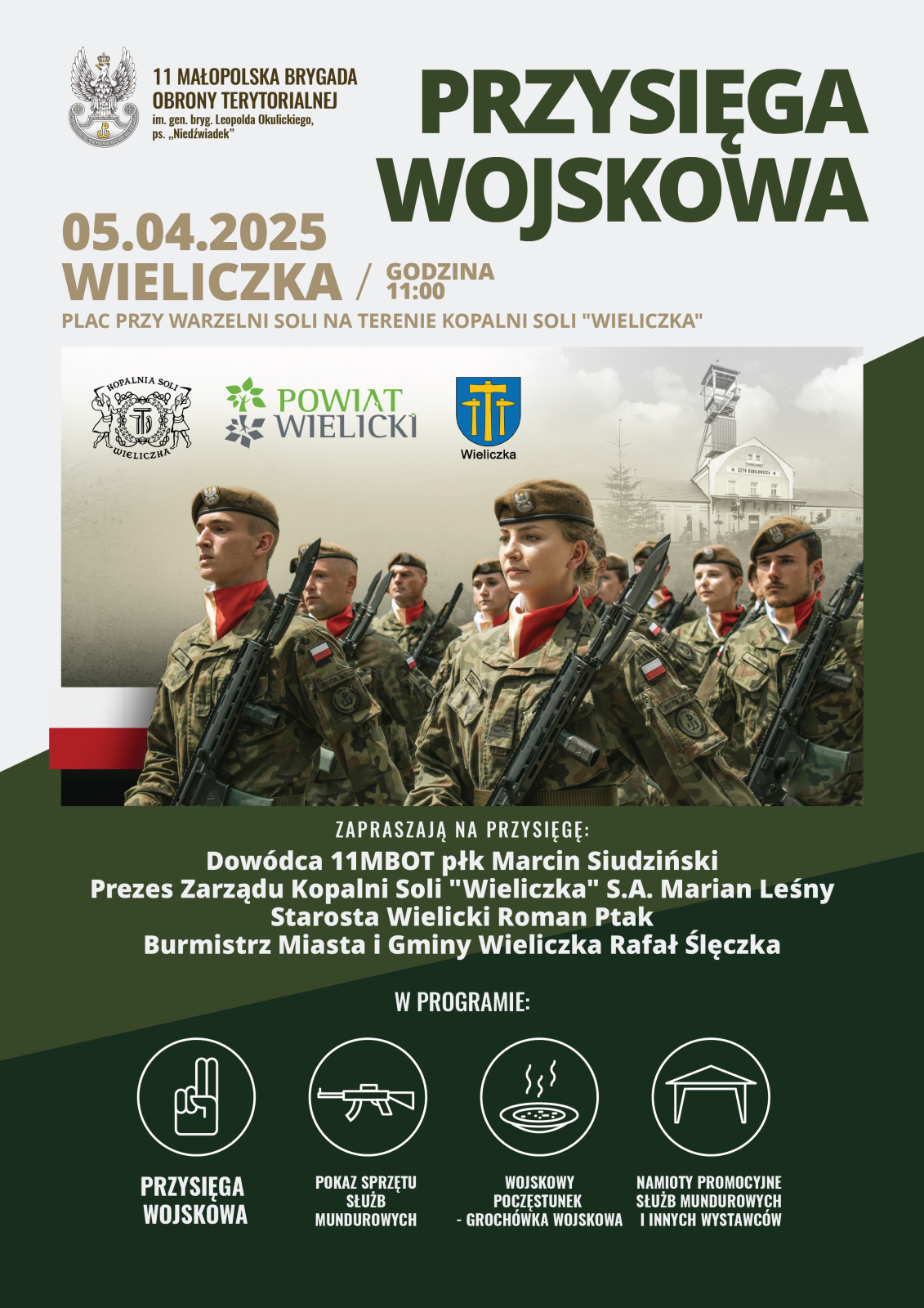 Uroczystość 5 kwietnia, po raz pierwszy odbędzie się na terenie Kopalni Soli „Wieliczka”. Na przysięgę zapraszają: Dowódca 11 Małopolskiej Brygady Obrony Terytorialnej płk Marcin Siudziński, Prezes Zarządu Kopalni Soli „Wieliczka” S.A. Marian Leśny, Starosta Wielicki Roman Ptak oraz Burmistrz Miasta i Gminy Wieliczka Rafał Ślęczka.