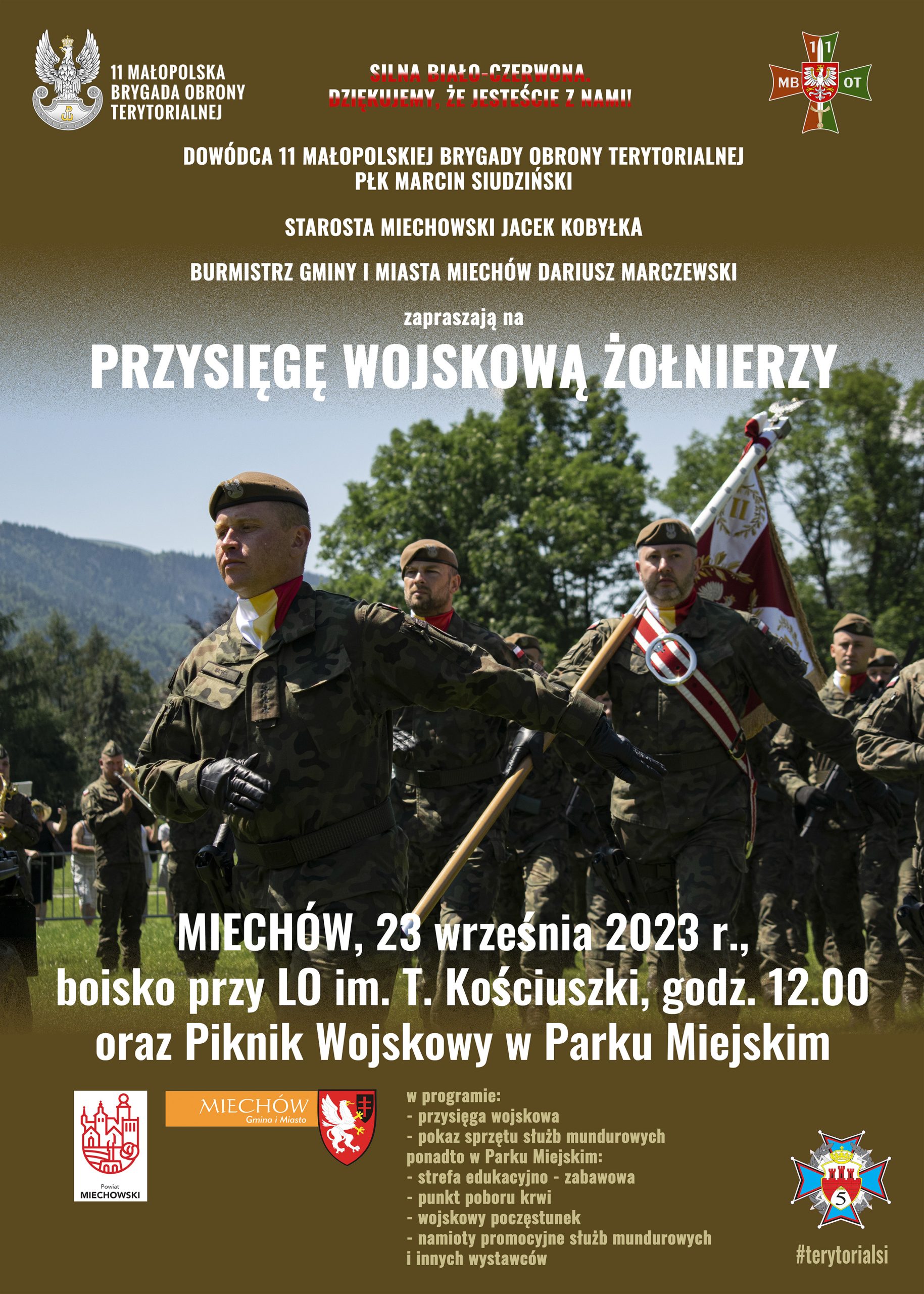 W sobotę 23 września 2023 r. o godzinie 12:00 na boisku przy Liceum Ogólnokształcącym im. T. Kościuszki w Miechowie, odbędzie się uroczysta przysięga wojskowa żołnierzy 11 Małopolskiej Brygady Obrony Terytorialnej oraz 5 Batalionu Dowodzenia z podkrakowskiej Rząski. Wśród składających przysięgę nie zabraknie również mieszkańcy Powiatu Brzeskiego.