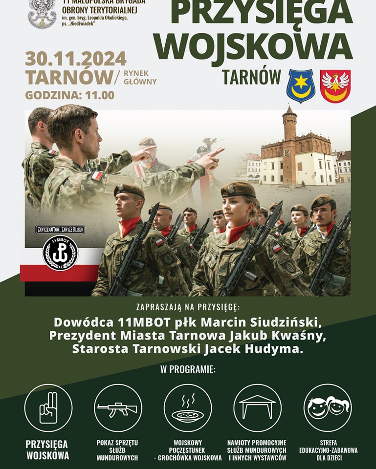 Małopolscy Terytorialsi serdecznie zapraszają na przysięgę, która odbędzie się w sobotę 30 listopada 2024 r. o godz. 11:00 na Rynku w Tarnowie. Wydarzenie odbywa się w mieście nad Białą po raz drugi w ostatnich latach.