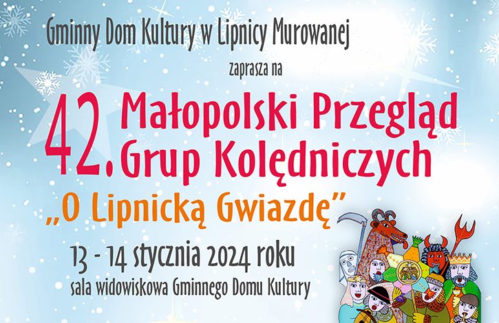 Gminny Dom Kultury w Lipnicy Murowanej wraz ze współorganizatorami – Małopolski Centrum Kultury SOKÓŁ w Nowym Sączu oraz Parafią pw. św. Andrzeja Ap. w Lipnicy Murowanej serdecznie zapraszają na 42. Małopolski Przegląd Grup Kolędniczych „O Lipnicką Gwiazdę”. Pełne śpiewu, muzyki, kolęd, pastorałek, tradycji i niezwykłych widowisk przedsięwzięcie odbędzie się w dniach 13-14 stycznia 2024 r. w sali widowiskowej GDK od godziny 14:00. Swój udział w przeglądzie zapowiedziało 10 dziecięcych, 4 młodzieżowe oraz 8 dorosłych grup.