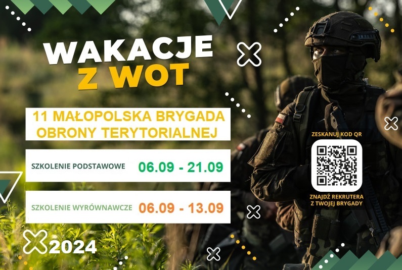 „Wakacje z WOT” to ogólnopolski projekt, którego założeniem jest dopasowanie terminów szkoleń kandydatów do służby do czasu wolnego np. od pracy i nauki na studiach. Dzięki temu ochotnicy mogą zbalansować wyzwania wynikające ze służby wojskowej i aktywności zawodowej. Atutem terytorialnej służby wojskowej jest także szkolenie w pobliżu miejsca zamieszkania. Chcesz wstąpić do 11 Małopolskiej Brygady OT ? Nic prostszego! Skontaktuj się z naszym rekrutem https://rekruterzy.terytorialsiwp.mil.pl/ . Wniosek o powołanie możesz złożyć bezpośrednio w najbliższym Wojskowym Centrum Rekrutacji lub elektronicznie przez platformę epuap.