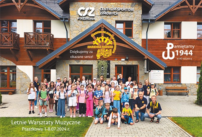Za nami letnie warsztaty muzyczne Ptaszkowa 2024. Osoby śledzące relacje z poszczególnych dni naszego pobytu w Ptaszkowej (Zdjęcia na stronie internetowej Ziarenek Nadziei <==), mogły zauważyć, że podczas wyjazdu pracowaliśmy nad warsztatem muzycznym przygotowując koncert „1944 – Pamiętamy” upamiętniający 80-rocznicę wybuchu Powstania Warszawskiego. Każdy dzień rozpoczynaliśmy wspólną modlitwą brewiarzową śpiewając Jutrznię, później był czas na śniadanie i wspomnianą część warsztatową. W samo południe spotykaliśmy się na Mszy św. po której udawaliśmy się na obiad. Po posiłku, był czas na wycieczki, zabawę, relaks i odpoczynek. Dzień kończyliśmy pogodnymi wieczorami, podczas których organizowane, były różnorakie konkursy. Tuż przed spaniem wspólna modlitwa i Apel Jasnogórski. Wszystkie niezapomniane chwile na zawsze pozostaną w naszej pamięci, a efekty naszej pracy zaprezentujemy 6 października podczas koncertu w RCKB. Już dziś serdecznie zapraszamy wszystkich na nasz koncert! Jesteśmy pewni, że będzie to niepowtarzalne wydarzenie pełne wzruszeń i pięknej muzyki.
