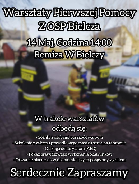 Druhowie z jednostki OSP Bielcza serdecznie zapraszają na warsztaty pierwszej pomocy, które odbędą się w niedzielę 14 maja 2023 r. od godziny 14:00 w remizie. Wstęp wolny.
