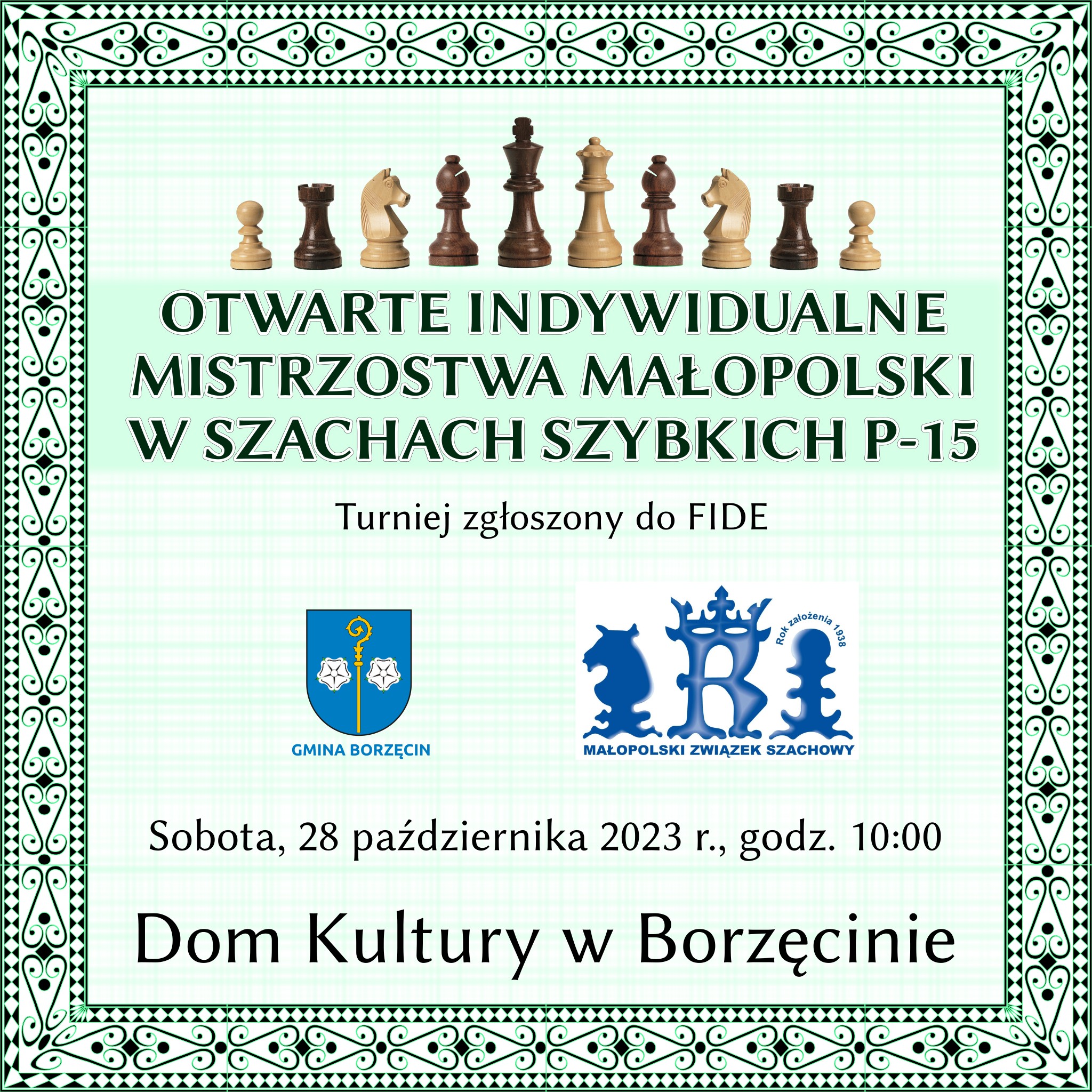 W sobotę 28 października br. odbędą się na Otwarte Indywidualne Mistrzostwa Małopolski w Szachach Szybkich P-15. Od godziny 10 w sali imprez Domu Kultury w Borzęcinie zawodnicy rywalizować będą w systemie szwajcarskim na dystansie 9 rund. Prawo gry w zawodach posiada każdy szachista zarejestrowany w centralnym rejestrze Polskiego Związku Szachowego, jednak bez względu na posiadaną kategorię szachową, przynależność klubową i miejsce zamieszkania.