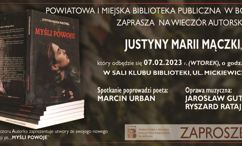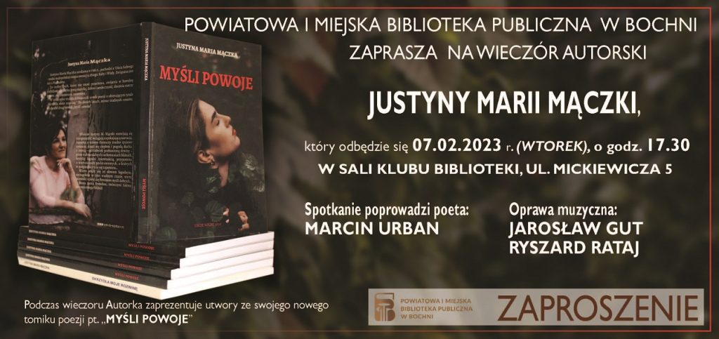 Powiatowa i Miejska Biblioteka Publiczna zaprasza 7 lutego 2023 r. o godz. 17.30 na Wieczór Autorski poetki Justyny Marii Mączki i promocję jej drugiego tomiku wierszy „Myśli powoje”. Spotkanie poprowadzi Marcin Urban, oprawa muzyczna: Jarosław Gut i Ryszard Rataj.