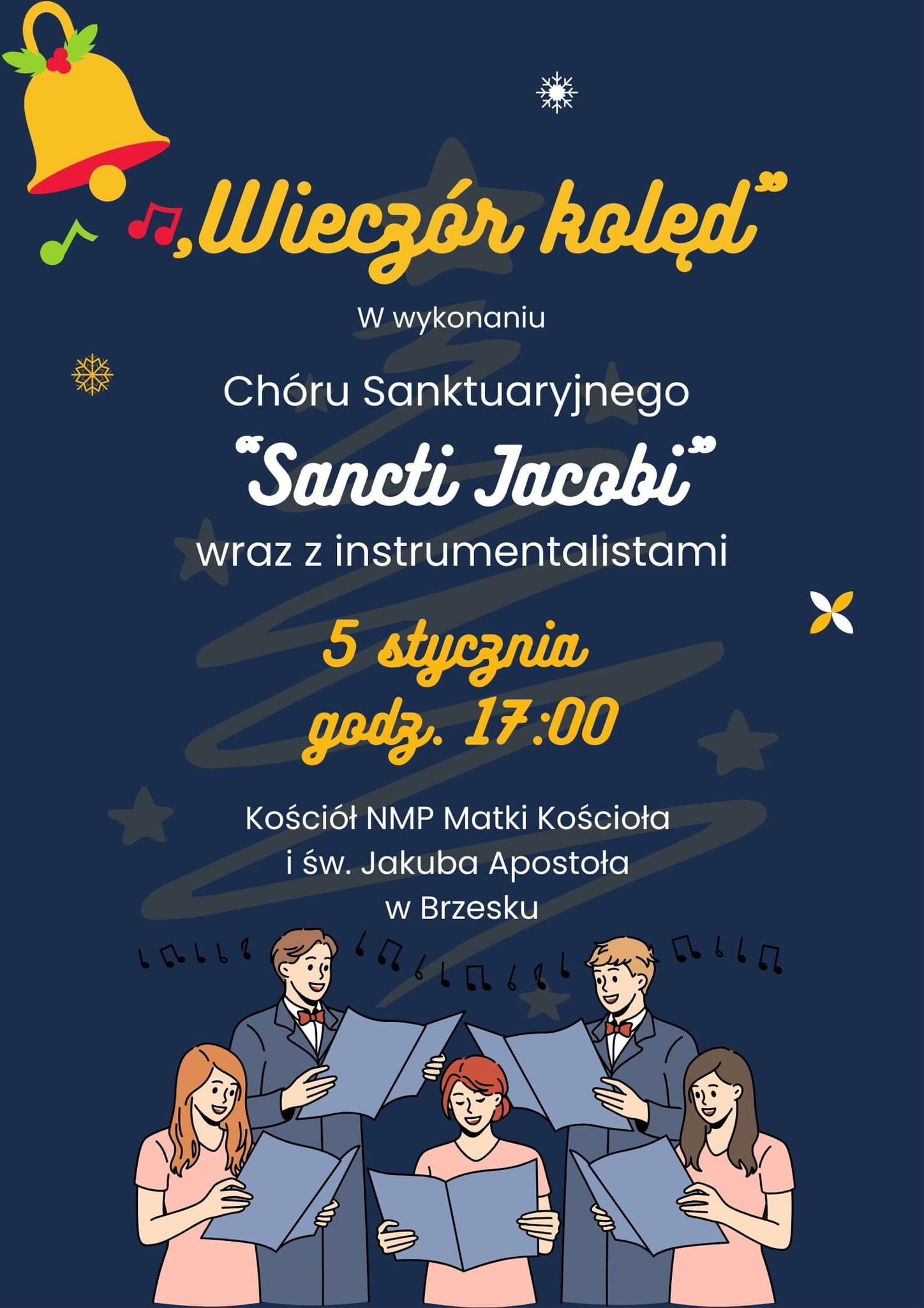 W niedzielę 5 stycznia 2025 r. w kościele NMP Matki Kościoła i Św. Jakuba w Brzesku o godiznie 17.00 odbędzie się „Wieczór kolęd” w wykonaniu Chóru Sanktuaryjnego Sancti Jacobi wraz z instrumentalistami.