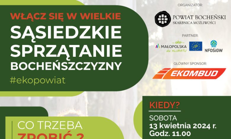 Zależy ci na estetyce swojego otoczenia? Masz dość śmieci na chodnikach, skwerach, rowach i wszędzie tam gdzie nie powinno ich być? Starostwo Powiatowe zachęca do udziału w Wielkim Sąsiedzkim Sprzątaniu Bocheńszczyzny!