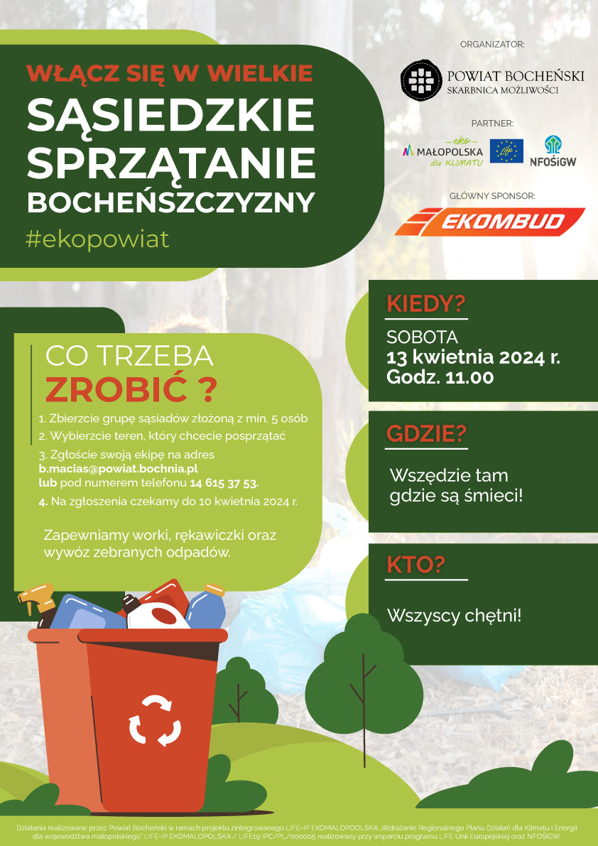 Zależy ci na estetyce swojego otoczenia? Masz dość śmieci na chodnikach, skwerach, rowach i wszędzie tam gdzie nie powinno ich być? Starostwo Powiatowe zachęca do udziału w Wielkim Sąsiedzkim Sprzątaniu Bocheńszczyzny!