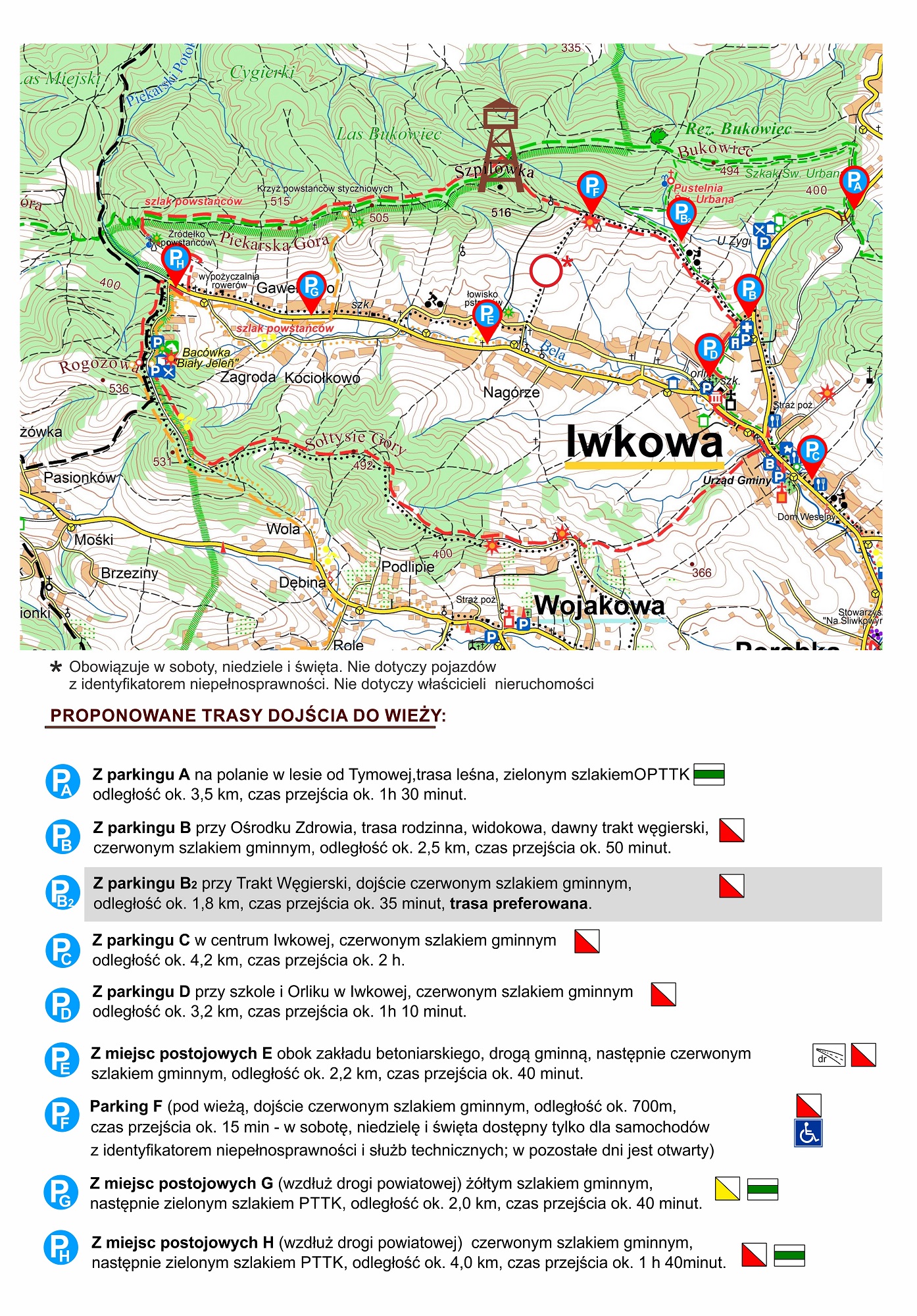 ● Parking D (przy szkole i orliku w Iwkowej, dojście czerwonym szlakiem gminnym, odległość ok. 3,2 km, czas przejścia ok. 1 h 10 min)
