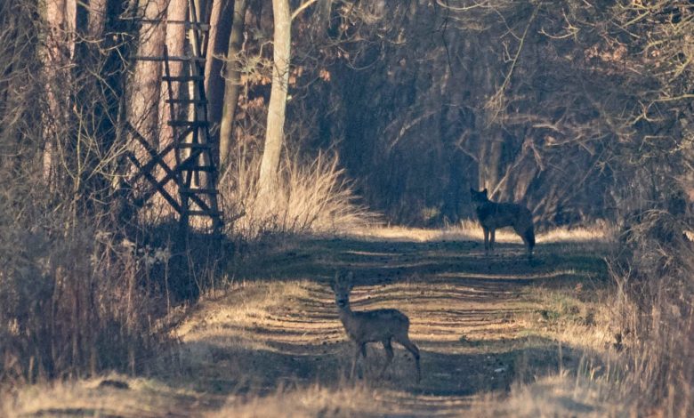 Wilk w Lasach Wierzchosławickich. Niezwykłe ujęcie z młodą sarną