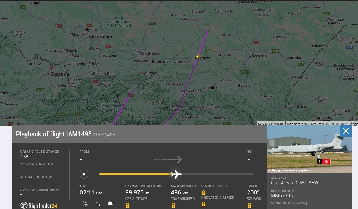Profil Polish Military Radar poinformował, że włoski samolot G550 CAEW rozpoczął po godzinie 22:30 17 listopada 2025 r. czasu lokalnego operację nad Polską. Platforma FlightRadar24 nie pokazywała lotu na terenie naszego kraju. Niemniej wiadomo, że we wtorek 18 listopada samolot około godziny 3:11 przelatywał nad Tarnowem, by kilkanaście minut później wylecieć z przestrzeni powietrznej naszego kraju, w locie powrotnym do bazy we Włoszech.