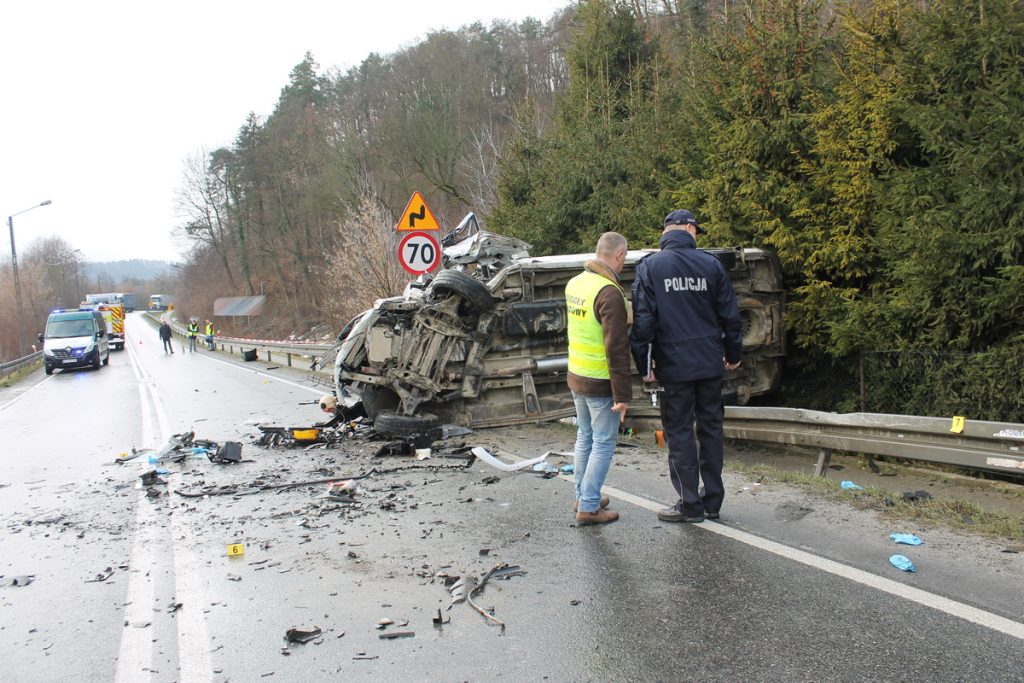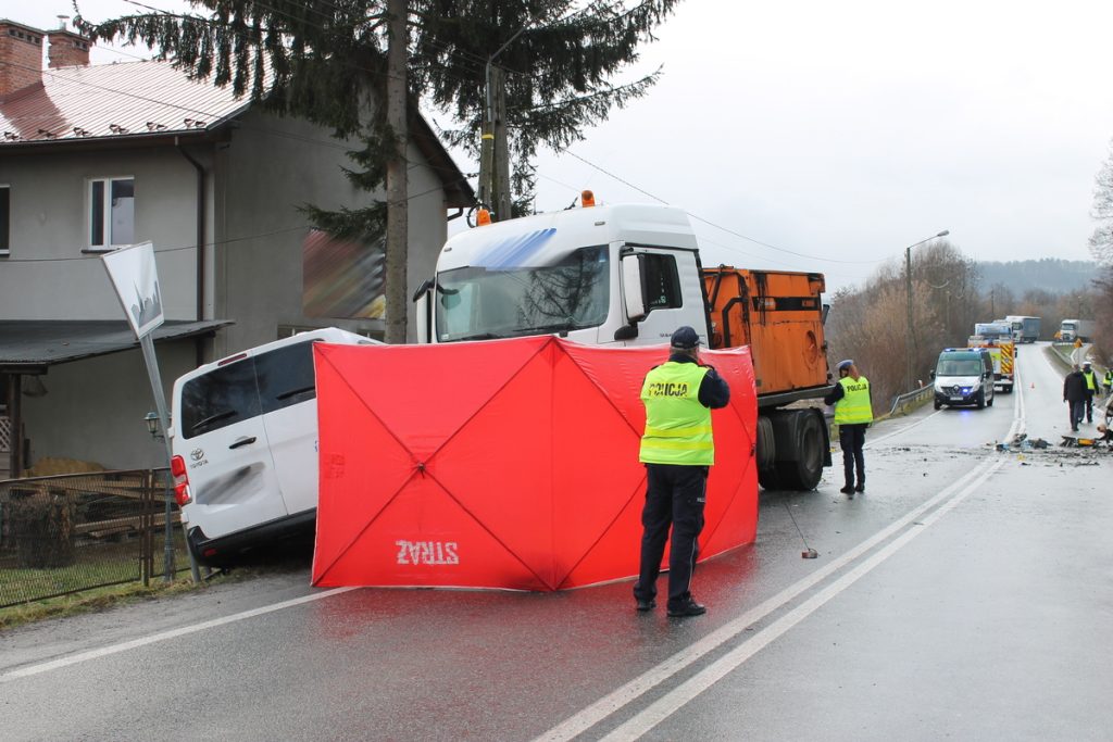 Dzisiaj po godzinie 6:00 na drodze krajowej nr 75 w Czchowie doszło do poważnego w skutkach wypadku drogowego. Ze wstępnych ustaleń wynika, że 52-letni kierujący busem marki Toyota przewożący 7 pasażerów z niewyjaśnionych przyczyn zjechał nagle na przeciwległy pas ruchu i uderzył w jadący z naprzeciwka pojazd dostawczy marki Mercedes. W następstwie uderzenia bus wrócił na pas, którym się poruszał i zderzył z jadącym tym pasem samochodem ciężarowym. W wyniku tego tragicznego zdarzenia śmierć poniósł 52-letni kierujący toyotą oraz jego 61-letni pasażer, obaj mieszkańcy powiatu nowosądeckiego. Do szpitala trafiło pozostałych 6 pasażerów busa oraz kierujący pojazdem dostawczym. Policjanci na miejscu wykonali czynności pod nadzorem prokuratora, w tym między innymi oględziny miejsca zdarzenia i pojazdów. Droga była przez kilka godzin całkowicie zablokowana a policjanci kierowali pojazdy na objazdy. Wyjaśnienie okoliczności tego tragicznego zdarzenia będzie przedmiotem postępowania prowadzonego przez brzeską prokuraturę i miejscowych policjantów.