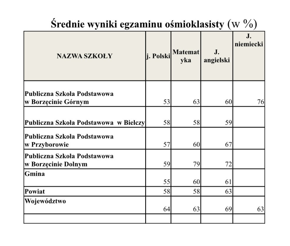 Szczegółowe zestawienie wyników egzaminu ośmioklasistów w gminie Borzęcin