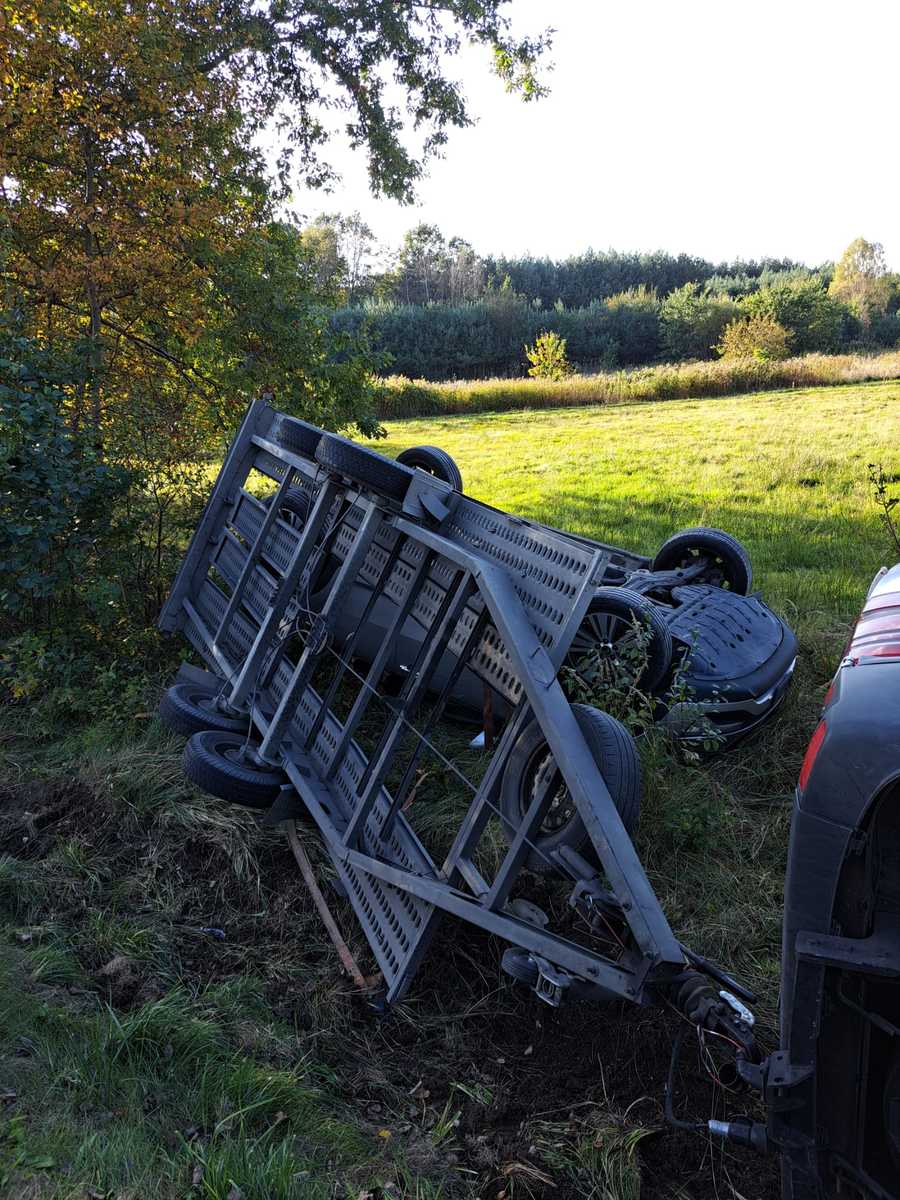 Na prostym odcinku drogi kierujący mercedesem podjął manewr wyprzedzania znajdujących się przed nim pojazdów. Gdy był na wysokości pojazdu renault zauważył, że w poprzek drogi przebiega dzikie, leśne zwierzę, a kierowca osobówki, jadący jako pierwszy, gwałtownie hamuje. Jadący za nim kierowca renault chcąc uniknąć zderzenia odbił w lewo, co z kolei spowodowało uderzenie w zespół pojazdów, którego kierowca stracił panowanie nad zestawem i wjechał do przydrożnego rowu, znajdującego się po lewej stronie drogi wojewódzkiej oznaczonej numerem 984. W zdarzeniu tym ucierpiał pasażer mercedesa, który został przetransportowany do tarnowskiego szpitala, gdzie został hospitalizowany. Uszkodzeniu uległy trzy pojazdy, mercedes ciągnący lawetę, przewożona kia, oraz motocykl bmw przewożony w przestrzeni ładunkowej mercedesa.