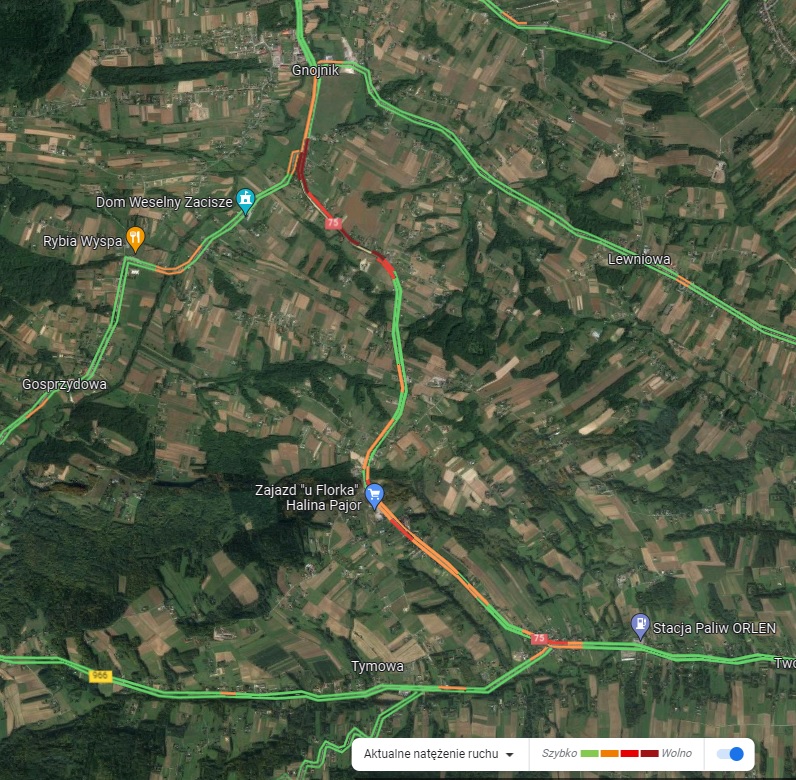 Mapa natężenia ruchu na DK 75 w rejonie gdzie doszło do wypadku / 23 maja 2023 r. / godz. 19.40