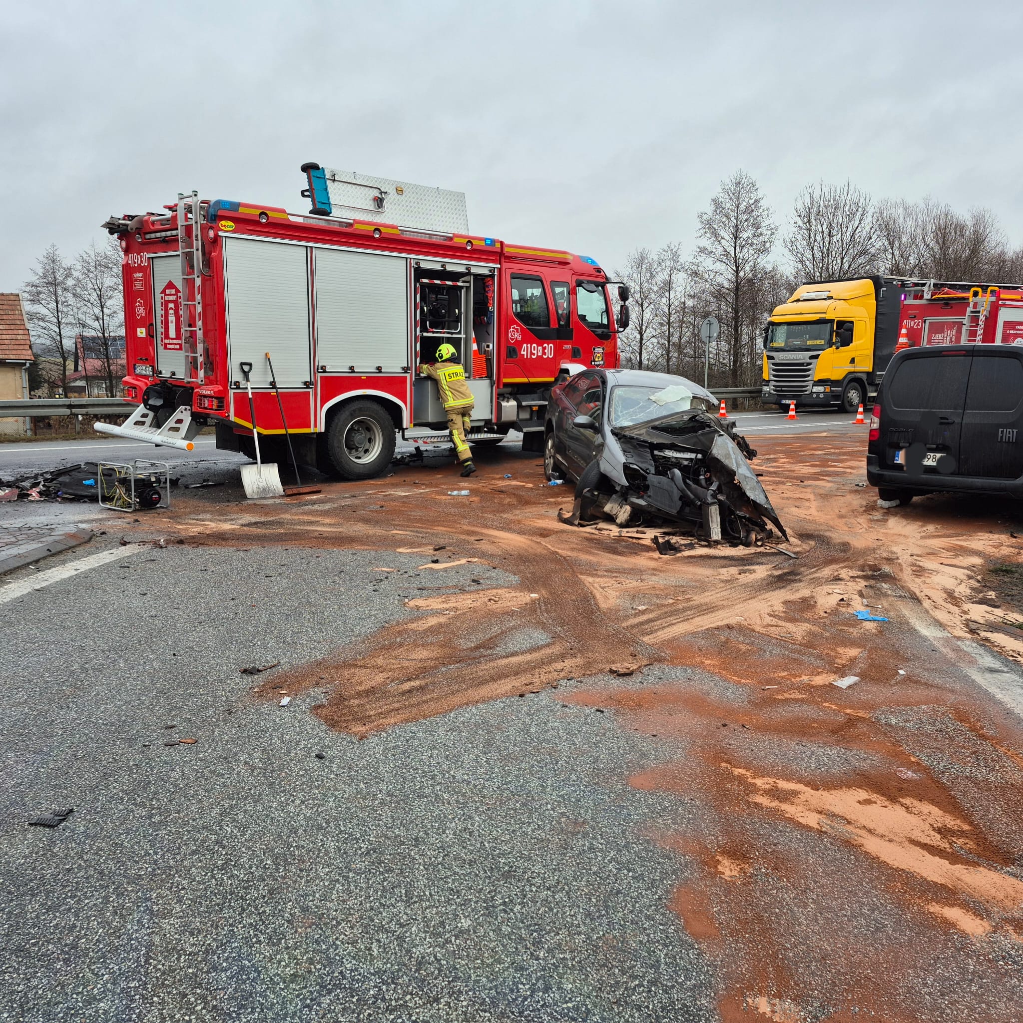 Kierowca jednego z samochodów osobowych był zakleszczony wewnątrz pojazdu. W celu stworzenia dostępu i umożliwienia ewakuacji strażacy wykorzystali hydrauliczne narzędzia ratownicze. Po usunięciu zdeformowanych elementów karoserii poszkodowany został wyciągnięty i przekazany ratownikom medycznym.