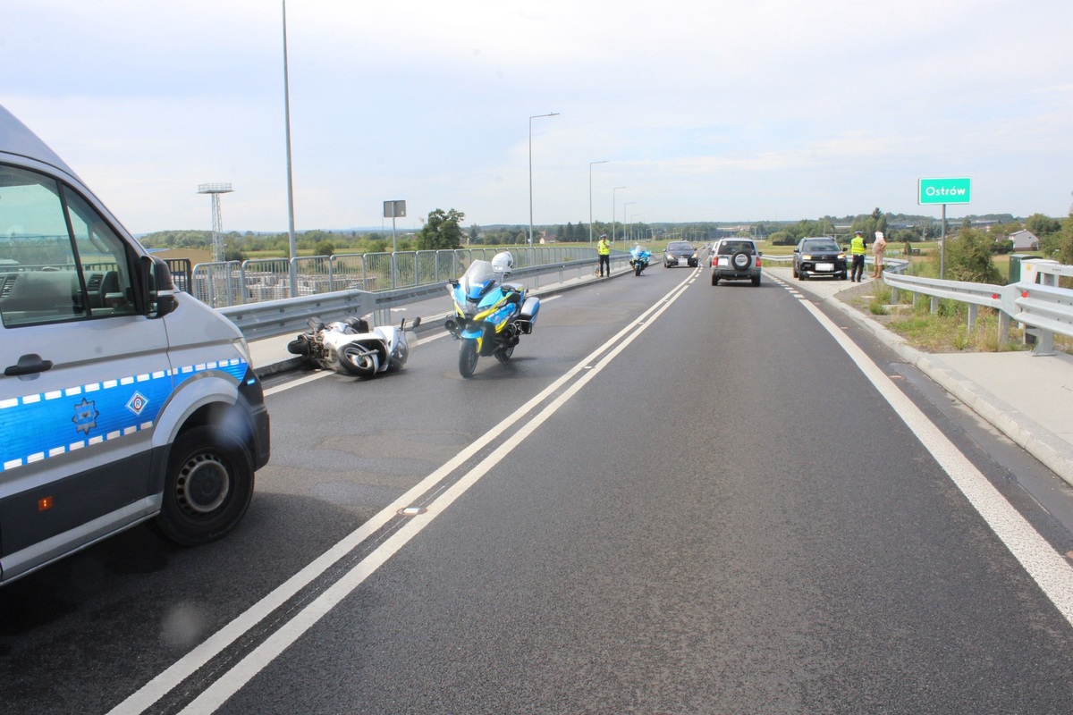 Niebezpieczne zderzenie motocykla z samochodem osobowym miało miejsce na moście w Ostrowie. Kierowca motocykla z urazem nogi trafił do szpitala.