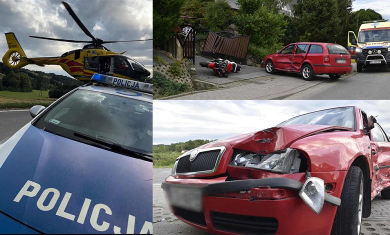W sobotnie popołudnie na drodze wojewódzkiej w kierunku Gromnika jechało kilka pojazdów osobowych. Pierwszy z nich, czerwona skoda, była kierowana przez 26-latkę z powiatu tarnowskiego. Gdy dojechał ona do posesji, zasygnalizowała zamiar wykonania manewru skrętu w lewo. W tym miejscu droga wojewódzka 977 prowadzi po lekkim łuku, a znaki na drodze wskazują linię podwójną ciągłą. Kilka pojazdów jadących za nią zatrzymało się, by kierowca wykonał zamierzony manewr, niestety w tym momencie kolumnę pojazdów zaczął wyprzedzać motocyklista. Nie zdążył on wyprzedzić wszystkich samochodów i uderzył w tylne drzwi skody. W wyniku tego zderzenia droga wojewódzka została całkowicie zablokowana, a utrudnienia trwały do godziny 21. Z uwagi na charakter wypadku zadysponowano helikopter pogotowia ratunkowego, który przetransportował rannego motocyklistę do szpitala w Krakowie. Lżej ranną kobietę przetransportowano do tarnowskiego szpitala.