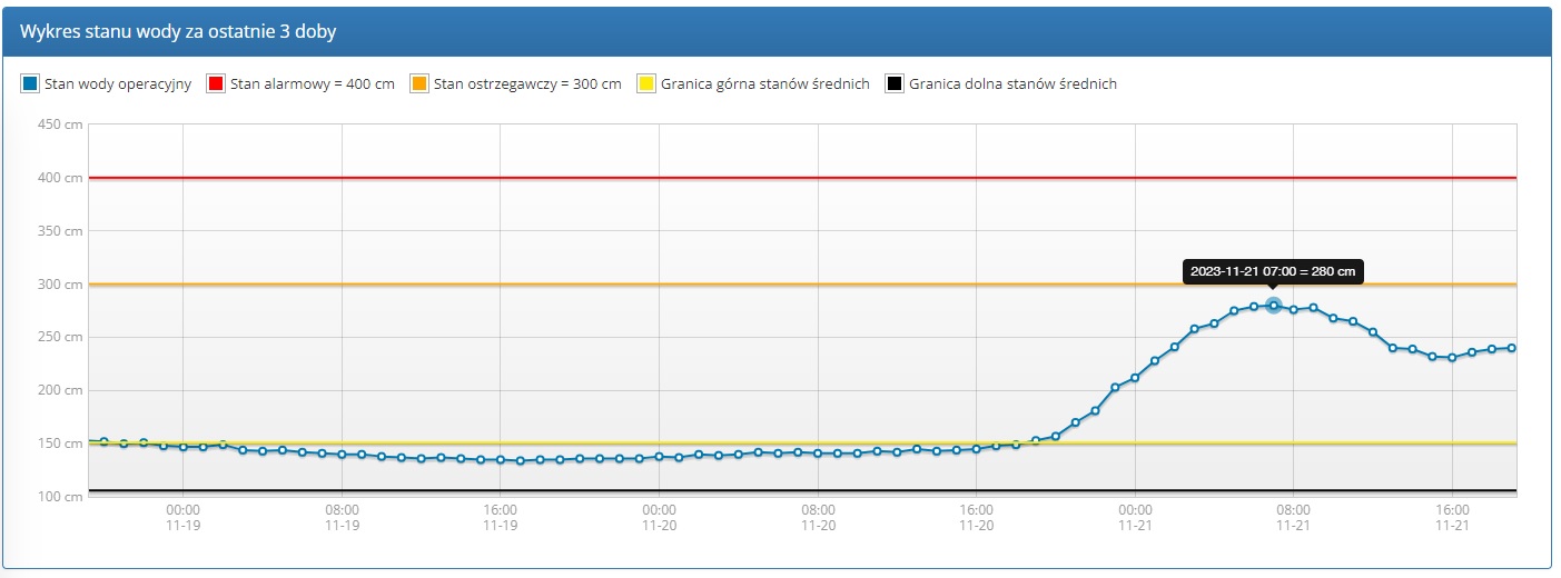 Stan wody za ostatnie 3 doby – Uszwica – wodowskaz w Borzęcinie / 21 listopada 2023 r.